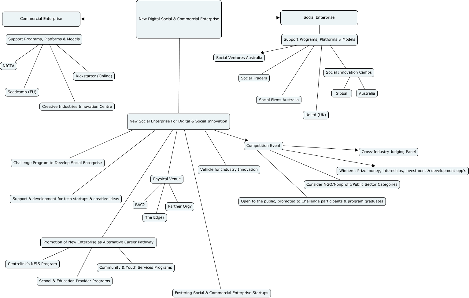 This Concept Map, created with IHMC CmapTools, has information related to: New Digital Enterprise, Promotion of New Enterprise as Alternative Career Pathway ???? Community & Youth Services Programs, Support Programs, Platforms & Models ???? Social Ventures Australia, Physical Venue ???? BAC?, Social Innovation Camps ???? Australia, Competition Event ???? Cross-Industry Judging Panel, Support Programs, Platforms & Models ???? Social Innovation Camps, Competition Event ???? Consider NGO/Nonprofit/Public Sector Categories, New Social Enterprise For Digital & Social Innovation ???? Vehicle for Industry Innovation, Promotion of New Enterprise as Alternative Career Pathway ???? Centrelink's NEIS Program, New Social Enterprise For Digital & Social Innovation ???? Competition Event, Support Programs, Platforms & Models ???? Kickstarter (Online), New Digital Social & Commercial Enterprise ???? Commercial Enterprise, Social Innovation Camps ???? Global, Social Enterprise ???? Support Programs, Platforms & Models, New Social Enterprise For Digital & Social Innovation ???? Support & development for tech startups & creative ideas, Commercial Enterprise ???? Support Programs, Platforms & Models, New Social Enterprise For Digital & Social Innovation ???? Challenge Program to Develop Social Enterprise, Competition Event ???? Open to the public, promoted to Challenge participants & program graduates, Physical Venue ???? The Edge?, Competition Event ???? Winners: Prize money, internships, investment & development opp's