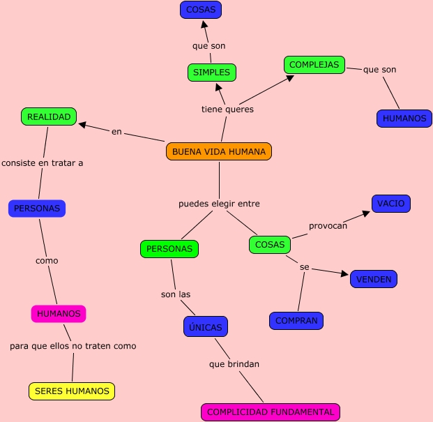 This Concept Map, created with IHMC CmapTools, has information related to: Daniela 2°A Despierta Baby, COSAS se COMPRAN, PERSONAS como HUMANOS, HUMANOS para que ellos no traten como SERES HUMANOS, BUENA VIDA HUMANA puedes elegir entre PERSONAS, SIMPLES que son COSAS, BUENA VIDA HUMANA tiene queres SIMPLES, BUENA VIDA HUMANA en REALIDAD, BUENA VIDA HUMANA puedes elegir entre COSAS, BUENA VIDA HUMANA tiene queres COMPLEJAS, COSAS provocan VACIO, PERSONAS son las ÚNICAS, ÚNICAS que brindan COMPLICIDAD FUNDAMENTAL, REALIDAD consiste en tratar a PERSONAS, COSAS se VENDEN, COMPLEJAS que son HUMANOS