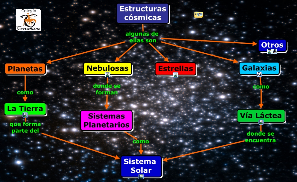 Este Cmap, tiene información relacionada con: Estructuras cósmicas, Estructuras cósmicas algunas de ellas son Planetas, Estructuras cósmicas algunas de ellas son Nebulosas, Galaxias como Vía Láctea, Vía Láctea donde se encuentra Sistema Solar, Planetas como La Tierra, Sistemas Planetarios como Sistema Solar, La Tierra que forma parte del Sistema Solar, Estructuras cósmicas algunas de ellas son Galaxias, Estructuras cósmicas algunas de ellas son Estrellas, Nebulosas donde se forman Sistemas Planetarios, Estructuras cósmicas algunas de ellas son Otros