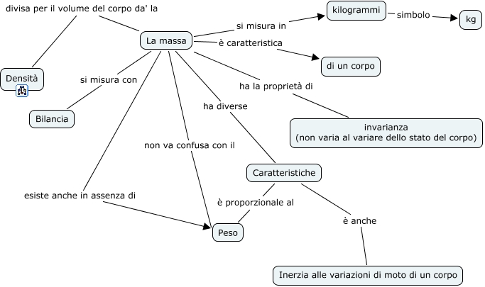 Questa Cmap, creata con IHMC CmapTools, contiene informazioni relative a: Massa, La massa ha la proprietà di invarianza (non varia al variare dello stato del corpo), La massa divisa per il volume del corpo da' la Densità, La massa si misura in kilogrammi, Caratteristiche è anche Inerzia alle variazioni di moto di un corpo, La massa ha diverse Caratteristiche, La massa esiste anche in assenza di Peso, kilogrammi simbolo kg, La massa è caratteristica di un corpo, La massa non va confusa con il Peso, Caratteristiche è proporzionale al Peso, La massa si misura con Bilancia