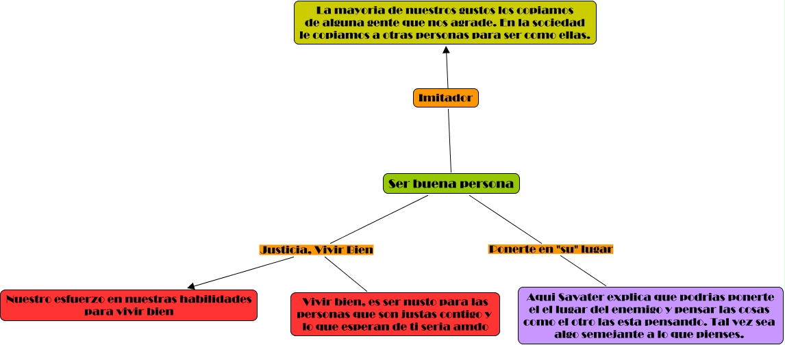 Este Cmap, tiene información relacionada con: FCE cap 7, Ser buena persona ???? La mayoria de nuestros gustos los copiamos de alguna gente que nos agrade. En la sociedad le copiamos a otras personas para ser como ellas., Ser buena persona Justicia, Vivir Bien Vivir bien, es ser nusto para las personas que son justas contigo y lo que esperan de ti seria amdo, Ser buena persona Ponerte en "su" lugar Aqui Savater explica que podrias ponerte el el lugar del enemigo y pensar las cosas como el otro las esta pensando. Tal vez sea algo semejante a lo que pienses., Ser buena persona Justicia, Vivir Bien Nuestro esfuerzo en nuestras habilidades para vivir bien