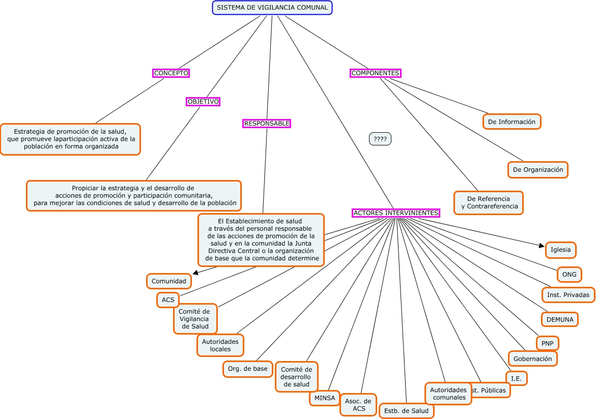Este Cmap, tiene información relacionada con: sitios, SISTEMA DE VIGILANCIA COMUNAL ACTORES INTERVINIENTES Gobernación, SISTEMA DE VIGILANCIA COMUNAL ACTORES INTERVINIENTES Org. de base, SISTEMA DE VIGILANCIA COMUNAL ACTORES INTERVINIENTES Inst. Privadas, SISTEMA DE VIGILANCIA COMUNAL ACTORES INTERVINIENTES PNP, SISTEMA DE VIGILANCIA COMUNAL ACTORES INTERVINIENTES ONG, SISTEMA DE VIGILANCIA COMUNAL ACTORES INTERVINIENTES I.E., SISTEMA DE VIGILANCIA COMUNAL ACTORES INTERVINIENTES DEMUNA, SISTEMA DE VIGILANCIA COMUNAL ACTORES INTERVINIENTES Comité de desarrollo de salud, SISTEMA DE VIGILANCIA COMUNAL COMPONENTES De Referencia y Contrareferencia, SISTEMA DE VIGILANCIA COMUNAL RESPONSABLE El Establecimiento de salud a través del personal responsable de las acciones de promoción de la salud y en la comunidad la Junta Directiva Central o la organización de base que la comunidad determine, SISTEMA DE VIGILANCIA COMUNAL ACTORES INTERVINIENTES Inst. Públicas, SISTEMA DE VIGILANCIA COMUNAL ACTORES INTERVINIENTES Comunidad, SISTEMA DE VIGILANCIA COMUNAL COMPONENTES De Información, SISTEMA DE VIGILANCIA COMUNAL ACTORES INTERVINIENTES Iglesia, SISTEMA DE VIGILANCIA COMUNAL CONCEPTO Estrategia de promoción de la salud, que promueve laparticipación activa de la población en forma organizada, SISTEMA DE VIGILANCIA COMUNAL ACTORES INTERVINIENTES Estb. de Salud, SISTEMA DE VIGILANCIA COMUNAL ACTORES INTERVINIENTES ACS, SISTEMA DE VIGILANCIA COMUNAL ACTORES INTERVINIENTES MINSA, SISTEMA DE VIGILANCIA COMUNAL OBJETIVO Propiciar la estrategia y el desarrollo de acciones de promoción y participación comunitaria, para mejorar las condiciones de salud y desarrollo de la población, SISTEMA DE VIGILANCIA COMUNAL ACTORES INTERVINIENTES Autoridades comunales