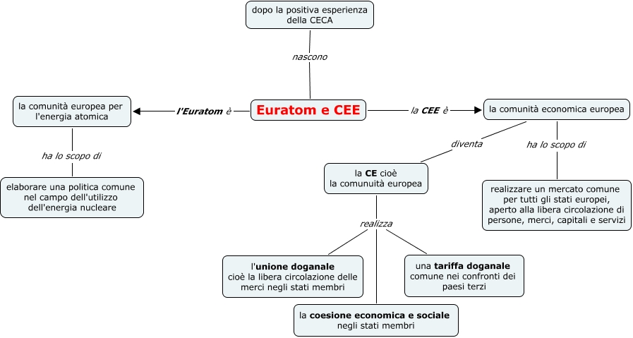 Questa Cmap, creata con IHMC CmapTools, contiene informazioni relative a: euratom e cee, Euratom e CEE l'Euratom è la comunità europea per l'energia atomica, dopo la positiva esperienza della CECA nascono ????, la comunità economica europea ha lo scopo di realizzare un mercato comune per tutti gli stati europei, aperto alla libera circolazione di persone, merci, capitali e servizi, la comunità europea per l'energia atomica ha lo scopo di elaborare una politica comune nel campo dell'utilizzo dell'energia nucleare, la comunità economica europea diventa la CE cioè la comunuità europea, la CE cioè la comunuità europea realizza una tariffa doganale comune nei confronti dei paesi terzi, la CE cioè la comunuità europea realizza la coesione economica e sociale negli stati membri, Euratom e CEE la CEE è la comunità economica europea, la CE cioè la comunuità europea realizza l'unione doganale cioè la libera circolazione delle merci negli stati membri