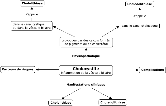 Cette carte de concepts créée avec IHMC CmapTools traite de: voies biliaires4, Cholecystite inflammation de la vésicule biliaire Physiopathologie provoquée par des calculs formés de pigments ou de cholestérol, dans le canal choledoque s'appelle Choledolithiase, Cholecystite inflammation de la vésicule biliaire ???? Facteurs de risques, Cholecystite inflammation de la vésicule biliaire Manifestations cliniques Choledolithiase, dans le canal cystique ou dans la vésicule biliaire s'appelle Cholelithiase, provoquée par des calculs formés de pigments ou de cholestérol ???? dans le canal choledoque, Cholecystite inflammation de la vésicule biliaire ???? Complications, Cholecystite inflammation de la vésicule biliaire Manifestations cliniques Cholelithiase, provoquée par des calculs formés de pigments ou de cholestérol ???? dans le canal cystique ou dans la vésicule biliaire