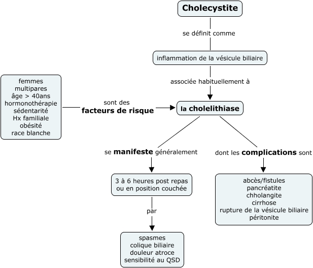 Cette carte de concepts créée avec IHMC CmapTools traite de: VB1, Cholecystite se définit comme inflammation de la vésicule biliaire, inflammation de la vésicule biliaire associée habituellement à la cholelithiase, 3 à 6 heures post repas ou en position couchée par spasmes colique biliaire douleur atroce sensibilité au QSD, la cholelithiase se manifeste généralement 3 à 6 heures post repas ou en position couchée, Cholecystite se définit comme inflammation de la vésicule biliaire, femmes multipares âge > 40ans hormonothérapie sédentarité Hx familiale obésité race blanche sont des facteurs de risque la cholelithiase, inflammation de la vésicule biliaire associée habituellement à la cholelithiase, la cholelithiase dont les complications sont abcès/fistules pancréatite chholangite cirrhose rupture de la vésicule biliaire péritonite