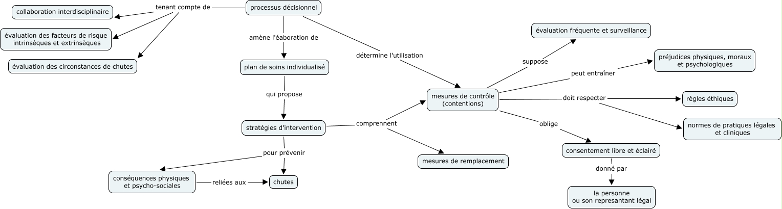 Cette carte de concepts créée avec IHMC CmapTools traite de: SIC 2.1, stratégies d'intervention comprennent mesures de remplacement, conséquences physiques et psycho-sociales reliées aux chutes, mesures de contrôle (contentions) doit respecter normes de pratiques légales et cliniques, stratégies d'intervention comprennent mesures de contrôle (contentions), consentement libre et éclairé donné par la personne ou son represantant légal, mesures de contrôle (contentions) doit respecter règles éthiques, stratégies d'intervention pour prévenir conséquences physiques et psycho-sociales, processus décisionnel détermine l'utilisation mesures de contrôle (contentions), mesures de contrôle (contentions) suppose évaluation fréquente et surveillance, mesures de contrôle (contentions) peut entraîner préjudices physiques, moraux et psychologiques, processus décisionnel tenant compte de évaluation des circonstances de chutes, processus décisionnel tenant compte de collaboration interdisciplinaire, stratégies d'intervention pour prévenir chutes, plan de soins individualisé qui propose stratégies d'intervention, processus décisionnel tenant compte de évaluation des facteurs de risque intrinsèques et extrinsèques, mesures de contrôle (contentions) oblige consentement libre et éclairé, processus décisionnel amène l'éaboration de plan de soins individualisé