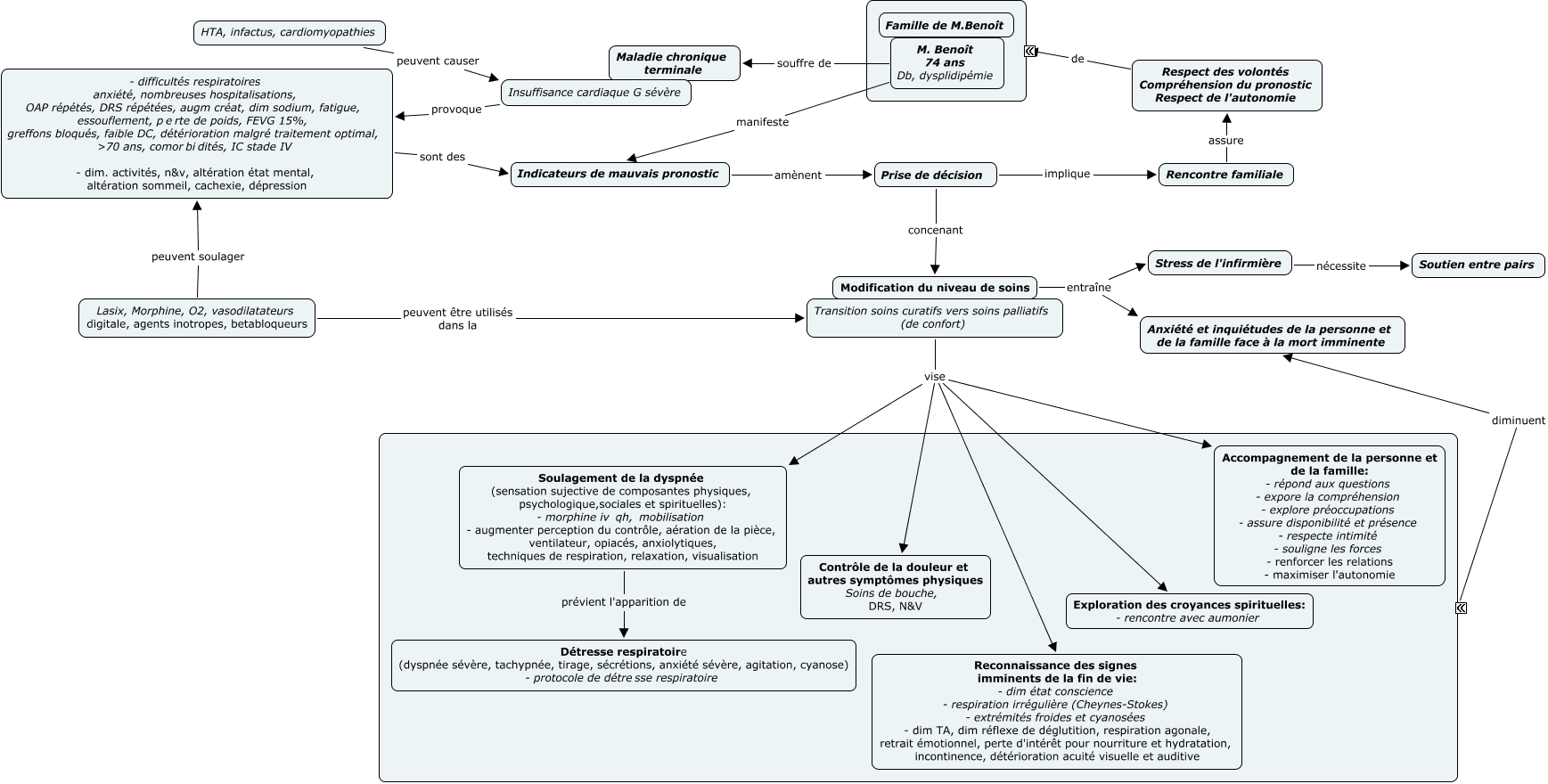 Cette carte de concepts créée avec IHMC CmapTools traite de: SIC M.Benoît, Soulagement de la dyspnée (sensation sujective de composantes physiques, psychologique,sociales et spirituelles): - morphine iv qh, mobilisation - augmenter perception du contrôle, aération de la pièce, ventilateur, opiacés, anxiolytiques, techniques de respiration, relaxation, visualisation prévient l'apparition de Détresse respiratoire (dyspnée sévère, tachypnée, tirage, sécrétions, anxiété sévère, agitation, cyanose) - protocole de détresse respiratoire, Transition soins curatifs vers soins palliatifs (de confort) vise Contrôle de la douleur et autres symptômes physiques Soins de bouche, DRS, N&V, Insuffisance cardiaque G sévère provoque - difficultés respiratoires anxiété, nombreuses hospitalisations, OAP répétés, DRS répétées, augm créat, dim sodium, fatigue, essouflement, perte de poids, FEVG 15%, greffons bloqués, faible DC, détérioration malgré traitement optimal, ans, comorbidités, IC stade IV - dim. activités, n&v, altération état mental, altération sommeil, cachexie, dépression, Transition soins curatifs vers soins palliatifs (de confort) vise Exploration des croyances spirituelles: - rencontre avec aumonier, Rencontre familiale assure Respect des volontés Compréhension du pronostic Respect de l'autonomie, Lasix, Morphine, O2, vasodilatateurs digitale, agents inotropes, betabloqueurs peuvent soulager - difficultés respiratoires anxiété, nombreuses hospitalisations, OAP répétés, DRS répétées, augm créat, dim sodium, fatigue, essouflement, perte de poids, FEVG 15%, greffons bloqués, faible DC, détérioration malgré traitement optimal, ans, comorbidités, IC stade IV - dim. activités, n&v, altération état mental, altération sommeil, cachexie, dépression, Prise de décision implique Rencontre familiale, Respect des volontés Compréhension du pronostic Respect de l'autonomie de ????, M. Benoît 74 ans Db, dysplidipémie souffre de Maladie chronique terminale, Transition soins curatifs vers soins palliatifs (de confort) vise Soulagement de la dyspnée (sensation sujective de composantes physiques, psychologique,sociales et spirituelles): - morphine iv qh, mobilisation - augmenter perception du contrôle, aération de la pièce, ventilateur, opiacés, anxiolytiques, techniques de respiration, relaxation, visualisation, Indicateurs de mauvais pronostic amènent Prise de décision, Modification du niveau de soins entraîne Anxiété et inquiétudes de la personne et de la famille face à la mort imminente, Lasix, Morphine, O2, vasodilatateurs digitale, agents inotropes, betabloqueurs peuvent être utilisés dans la Transition soins curatifs vers soins palliatifs (de confort), Transition soins curatifs vers soins palliatifs (de confort) vise Accompagnement de la personne et de la famille: - répond aux questions - expore la compréhension - explore préoccupations - assure disponibilité et présence - respecte intimité - souligne les forces - renforcer les relations - maximiser l'autonomie, - difficultés respiratoires anxiété, nombreuses hospitalisations, OAP répétés, DRS répétées, augm créat, dim sodium, fatigue, essouflement, perte de poids, FEVG 15%, greffons bloqués, faible DC, détérioration malgré traitement optimal, ans, comorbidités, IC stade IV - dim. activités, n&v, altération état mental, altération sommeil, cachexie, dépression sont des Indicateurs de mauvais pronostic, ???? diminuent Anxiété et inquiétudes de la personne et de la famille face à la mort imminente, M. Benoît 74 ans Db, dysplidipémie manifeste Indicateurs de mauvais pronostic, Modification du niveau de soins entraîne Stress de l'infirmière, Transition soins curatifs vers soins palliatifs (de confort) vise Reconnaissance des signes imminents de la fin de vie: - dim état conscience - respiration irrégulière (Cheynes-Stokes) - extrémités froides et cyanosées - dim TA, dim réflexe de déglutition, respiration agonale, retrait émotionnel, perte d'intérêt pour nourriture et hydratation, incontinence, détérioration acuité visuelle et auditive, Stress de l'infirmière nécessite Soutien entre pairs
