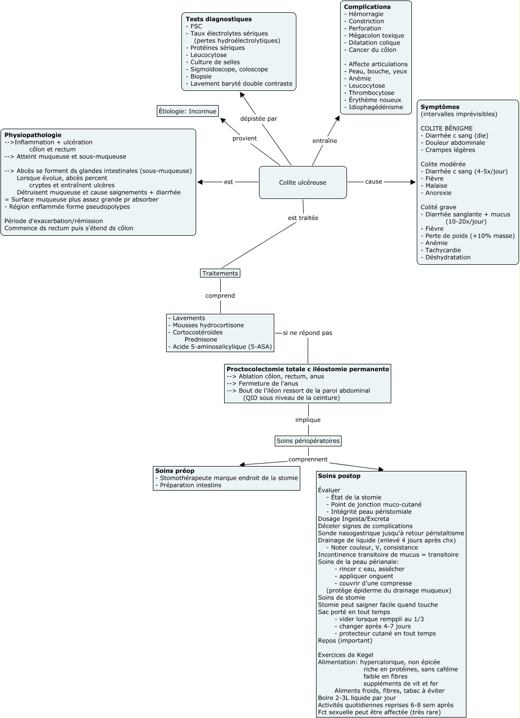 Cette carte de concepts créée avec IHMC CmapTools traite de: Proctocolectomie c iléostomie permanente (colie ulcéreuse), Colite ulcéreuse est traitée Traitements, Colite ulcéreuse dépistée par Tests diagnostiques - FSC - Taux électrolytes sériques (pertes hydroélectrolytiques) - Protéines sériques - Leucocytose - Culture de selles - Sigmoïdoscope, coloscope - Biopsie - Lavement baryté double contraste, Colite ulcéreuse provient Étiologie: Inconnue, Colite ulcéreuse entraîne Complications - Hémorragie - Constriction - Perforation - Mégacolon toxique - Dilatation colique - Cancer du côlon - Affecte articulations - Peau, bouche, yeux - Anémie - Leucocytose - Thrombocytose - Érythème noueux - Idiophagédénisme, Soins périopératoires comprennent Soins postop Évaluer - État de la stomie - Point de jonction muco-cutané - Intégrité peau péristomiale Dosage Ingesta/Excreta Déceler signes de complications Sonde nasogastrique jusqu'à retour péristaltisme Drainage de liquide (enlevé 4 jours après chx) - Noter couleur, V, consistance Incontinence transitoire de mucus = transitoire Soins de la peau périanale: - rincer c eau, assécher - appliquer onguent - couvrir d'une compresse (protège épiderme du drainage muqueux) Soins de stomie Stomie peut saigner facile quand touche Sac porté en tout temps - vider lorsque remppli au 1/3 - changer après 4-7 jours - protecteur cutané en tout temps Repos (important) Exercices de Kegel Alimentation: hypercalorique, non épicée riche en protéines, sans caféine faible en fibres suppléments de vit et fer Aliments froids, fibres, tabac à éviter Boire 2-3L liquide par jour Activités quotidiennes reprises 6-8 sem après Fct sexuelle peut être affectée (très rare), Soins périopératoires comprennent Soins préop - Stomothérapeute marque endroit de la stomie - Préparation intestins, Traitements comprend - Lavements - Mousses hydrocortisone - Cortocostéroïdes Prednisone - Acide 5-aminosalicylique (5-ASA), Colite ulcéreuse cause Symptômes (intervalles imprévisibles) COLITE BÉNIGME - Diarrhée c sang (die) - Douleur abdominale - Crampes légères Colite modérée - Diarrhée c sang (4-5x/jour) - Fièvre - Malaise - Anorexie Colité grave - Diarrhée sanglante + mucus (10-20x/jour) - Fièvre - Perte de poids (+10% masse) - Anémie - Tachycardie - Déshydratation, Colite ulcéreuse est Physiopathologie -->Inflammation + ulcération côlon et rectum --> Atteint muqueuse et sous-muqueuse --> Abcès se forment ds glandes intestinales (sous-muqueuse) Lorsque évolue, abcès percent cryptes et entraînent ulcères Détruisent muqueuse et cause saignements + diarrhée = Surface muqueuse plus assez grande pr absorber - Région enflammée forme pseudopolypes Période d'exacerbation/rémission Commence ds rectum puis s'étend ds côlon, Proctocolectomie totale c iléostomie permanente --> Ablation côlon, rectum, anus --> Fermeture de l'anus --> Bout de l'iléon ressort de la paroi abdominal (QID sous niveau de la ceinture) implique Soins périopératoires, - Lavements - Mousses hydrocortisone - Cortocostéroïdes Prednisone - Acide 5-aminosalicylique (5-ASA) si ne répond pas Proctocolectomie totale c iléostomie permanente --> Ablation côlon, rectum, anus --> Fermeture de l'anus --> Bout de l'iléon ressort de la paroi abdominal (QID sous niveau de la ceinture)