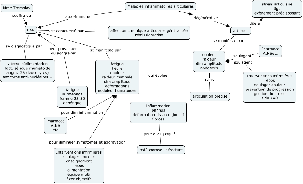 Cette carte de concepts créée avec IHMC CmapTools traite de: PAR 1, PAR se diagnostique par vitesse sédimentation fact. sérique rhumatoîde augm. GB (leucocytes) anticorps anti-nucléaires +, Maladies inflammatoires articulaires dégénérative arthrose, PAR se manifeste par fatigue fièvre douleur raideur matinale dim amplitude déformations nodules rhumatoîdes, douleur raideur dim amplitude nodosités dans articulation précise, arthrose se manifeste par douleur raideur dim amplitude nodosités, fatigue fièvre douleur raideur matinale dim amplitude déformations nodules rhumatoîdes qui évolue inflammation pannus déformation tissu conjonctif fibrose, Interventions infirmières soulager douleur enseignement repos alimentation équipe multi fixer objectifs pour diminuer symptômes et aggravation fatigue fièvre douleur raideur matinale dim amplitude déformations nodules rhumatoîdes, arthrose dûe à stress articulaire âge évènement prédisposant, Interventions infirmières repos soulager douleur prévention de progression gestion du stress aide AVQ soulagent douleur raideur dim amplitude nodosités, Mme Tremblay souffre de PAR, PAR est caractérisé par affection chronique articulaire généralisée rémission/crise, Pharmaco AINSetc soulagent douleur raideur dim amplitude nodosités, Pharmaco AINS etc pour dim inflammation fatigue fièvre douleur raideur matinale dim amplitude déformations nodules rhumatoîdes, fatigue surmenage femme 25-50 génétique peut provoquer ou agggraver PAR, inflammation pannus déformation tissu conjonctif fibrose peut aller jusqu'à ostéoporose et fracture, Maladies inflammatoires articulaires auto-immune PAR