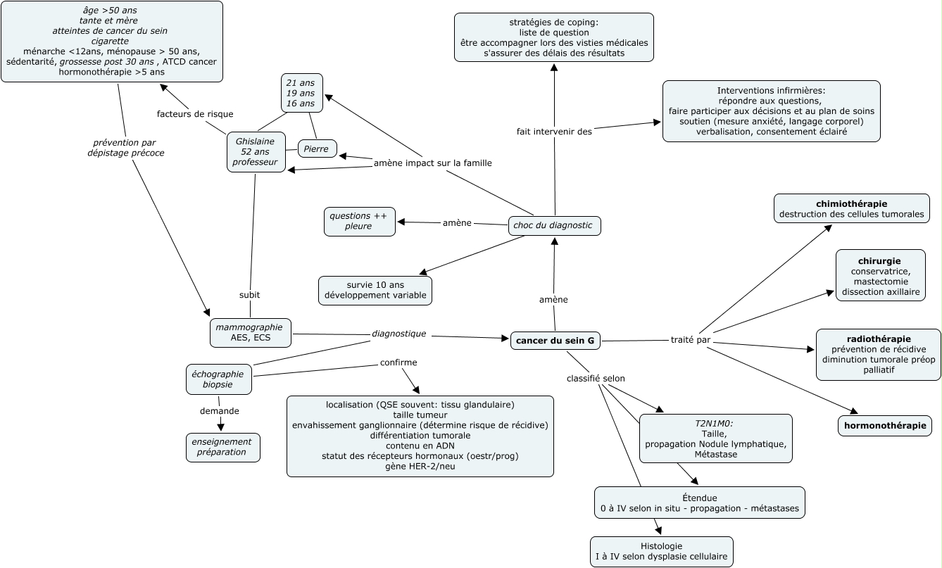 Cette carte de concepts créée avec IHMC CmapTools traite de: Cancer sein, choc du diagnostic ???? survie 10 ans développement variable, mammographie AES, ECS diagnostique cancer du sein G, cancer du sein G amène choc du diagnostic, cancer du sein G classifié selon T2N1M0: Taille, propagation Nodule lymphatique, Métastase, cancer du sein G classifié selon Étendue 0 à IV selon in situ - propagation - métastases, choc du diagnostic amène questions ++ pleure, Ghislaine 52 ans professeur facteurs de risque âge ᡪ ans tante et mère atteintes de cancer du sein cigarette ménarche ans, ménopause > 50 ans, sédentarité, grossesse post 30 ans, ATCD cancer hormonothérapie ɱ ans, Ghislaine 52 ans professeur ???? Pierre, choc du diagnostic fait intervenir des Interventions infirmières: répondre aux questions, faire participer aux décisions et au plan de soins soutien (mesure anxiété, langage corporel) verbalisation, consentement éclairé, cancer du sein G traité par chimiothérapie destruction des cellules tumorales, âge ᡪ ans tante et mère atteintes de cancer du sein cigarette ménarche ans, ménopause > 50 ans, sédentarité, grossesse post 30 ans, ATCD cancer hormonothérapie ɱ ans prévention par dépistage précoce mammographie AES, ECS, échographie biopsie demande enseignement préparation, choc du diagnostic amène impact sur la famille Pierre, cancer du sein G traité par hormonothérapie, 21 ans 19 ans 16 ans ???? Pierre, cancer du sein G traité par radiothérapie prévention de récidive diminution tumorale préop palliatif, échographie biopsie confirme localisation (QSE souvent: tissu glandulaire) taille tumeur envahissement ganglionnaire (détermine risque de récidive) différentiation tumorale contenu en ADN statut des récepteurs hormonaux (oestr/prog) gène HER-2/neu, Ghislaine 52 ans professeur subit mammographie AES, ECS, 21 ans 19 ans 16 ans ???? Ghislaine 52 ans professeur, choc du diagnostic amène impact sur la famille 21 ans 19 ans 16 ans