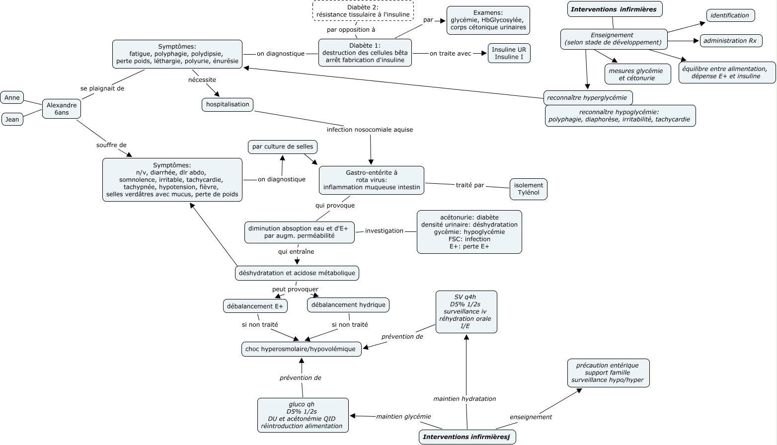 Cette carte de concepts créée avec IHMC CmapTools traite de: DB1 gastro, gluco qh D5% 1/2s DU et acétonémie QID réintroduction alimentation prévention de choc hyperosmolaire/hypovolémique, Interventions infirmièresj enseignement précaution entérique support famille surveillance hypo/hyper, déshydratation et acidose métabolique peut provoquer débalancement hydrique, Diabète 1: destruction des cellules bêta arrêt fabrication d'insuline par opposition à Diabète 2: résistance tissulaire à l'insuline, Gastro-entérite à rota virus: inflammation muqueuse intestin qui provoque diminution absoption eau et d'E+ par augm. perméabilité, par culture de selles ???? Gastro-entérite à rota virus: inflammation muqueuse intestin, Diabète 1: destruction des cellules bêta arrêt fabrication d'insuline on traite avec Insuline UR Insuline I, SV q4h D5% 1/2s surveillance iv réhydration orale I/E prévention de choc hyperosmolaire/hypovolémique, diminution absoption eau et d'E+ par augm. perméabilité investigation acétonurie: diabète densité urinaire: déshydratation gycémie: hypoglycémie FSC: infection E+: perte E+, débalancement hydrique si non traité choc hyperosmolaire/hypovolémique, Symptômes: n/v, diarrhée, dlr abdo, somnolence, irritable, tachycardie, tachypnée, hypotension, fièvre, selles verdâtres avec mucus, perte de poids on diagnostique par culture de selles, Anne ???? Alexandre 6ans, Interventions infirmières ???? Enseignement (selon stade de développement), Enseignement (selon stade de développement) ???? reconnaître hyperglycémie, Enseignement (selon stade de développement) ???? mesures glycémie et cétonurie, Alexandre 6ans souffre de Symptômes: n/v, diarrhée, dlr abdo, somnolence, irritable, tachycardie, tachypnée, hypotension, fièvre, selles verdâtres avec mucus, perte de poids, Gastro-entérite à rota virus: inflammation muqueuse intestin traité par isolement Tylénol, Interventions infirmièresj maintien glycémie gluco qh D5% 1/2s DU et acétonémie QID réintroduction alimentation, déshydratation et acidose métabolique ???? Symptômes: n/v, diarrhée, dlr abdo, somnolence, irritable, tachycardie, tachypnée, hypotension, fièvre, selles verdâtres avec mucus, perte de poids, Enseignement (selon stade de développement) ???? équilibre entre alimentation, dépense E+ et insuline