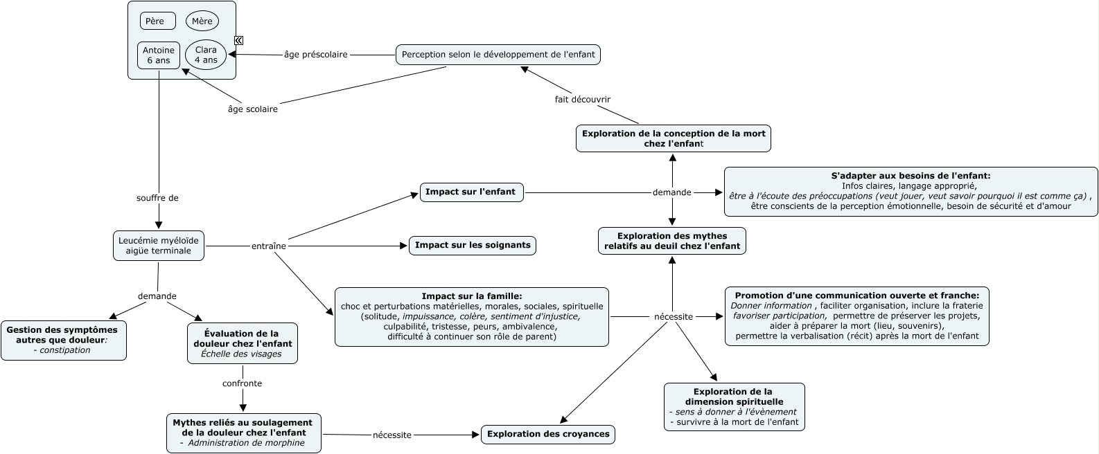 Cette carte de concepts créée avec IHMC CmapTools traite de: SIC 3 Antoine, Impact sur l'enfant demande S'adapter aux besoins de l'enfant: Infos claires, langage approprié, être à l'écoute des préoccupations (veut jouer, veut savoir pourquoi il est comme ça), être conscients de la perception émotionnelle, besoin de sécurité et d'amour, Exploration de la conception de la mort chez l'enfant fait découvrir Perception selon le développement de l'enfant, Évaluation de la douleur chez l'enfant Échelle des visages confronte Mythes reliés au soulagement de la douleur chez l'enfant - Administration de morphine, Leucémie myéloïde aigüe terminale entraîne Impact sur la famille: choc et perturbations matérielles, morales, sociales, spirituelle (solitude, impuissance, colère, sentiment d'injustice, culpabilité, tristesse, peurs, ambivalence, difficulté à continuer son rôle de parent), Perception selon le développement de l'enfant âge scolaire Antoine 6 ans, Leucémie myéloïde aigüe terminale demande Évaluation de la douleur chez l'enfant Échelle des visages, Impact sur l'enfant demande Exploration de la conception de la mort chez l'enfant, Impact sur l'enfant demande Exploration des mythes relatifs au deuil chez l'enfant, Impact sur la famille: choc et perturbations matérielles, morales, sociales, spirituelle (solitude, impuissance, colère, sentiment d'injustice, culpabilité, tristesse, peurs, ambivalence, difficulté à continuer son rôle de parent) nécessite Exploration des croyances, Impact sur la famille: choc et perturbations matérielles, morales, sociales, spirituelle (solitude, impuissance, colère, sentiment d'injustice, culpabilité, tristesse, peurs, ambivalence, difficulté à continuer son rôle de parent) nécessite Promotion d'une communication ouverte et franche: Donner information, faciliter organisation, inclure la fraterie favoriser participation, permettre de préserver les projets, aider à préparer la mort (lieu, souvenirs), permettre la verbalisation (récit) après la mort de l'enfant, Mythes reliés au soulagement de la douleur chez l'enfant - Administration de morphine nécessite Exploration des croyances, Leucémie myéloïde aigüe terminale entraîne Impact sur les soignants, Leucémie myéloïde aigüe terminale demande Gestion des symptômes autres que douleur: - constipation, Antoine 6 ans souffre de Leucémie myéloïde aigüe terminale, Leucémie myéloïde aigüe terminale entraîne Impact sur l'enfant, Perception selon le développement de l'enfant âge préscolaire Clara 4 ans, Impact sur la famille: choc et perturbations matérielles, morales, sociales, spirituelle (solitude, impuissance, colère, sentiment d'injustice, culpabilité, tristesse, peurs, ambivalence, difficulté à continuer son rôle de parent) nécessite Exploration de la dimension spirituelle - sens à donner à l'évènement - survivre à la mort de l'enfant, Impact sur la famille: choc et perturbations matérielles, morales, sociales, spirituelle (solitude, impuissance, colère, sentiment d'injustice, culpabilité, tristesse, peurs, ambivalence, difficulté à continuer son rôle de parent) nécessite Exploration des mythes relatifs au deuil chez l'enfant