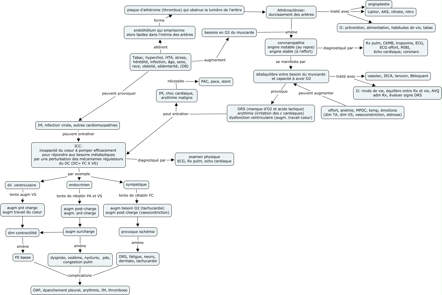 Cette carte de concepts créée avec IHMC CmapTools traite de: Angine ICC, augm besoin O2 (tachycardie) augm post charge (vasocontriction) ???? provoque ischémie, endocrinien tente de rétablir PA et VS augm post-charge augm. pré-charge, Athérosclérose: durcissement des artères traité avec II: prévention, alimentation, habitudes de vie, tabac, ICC: incapacité du coeur à pomper efficacement pour répondre aux besoins métaboliques par une perturbation des mécanismes régulateurs du DC (DC= FC X VS) diagnotiqué par examen physique ECG, Rx pulm, echo cardiaque, endothélium qui emprisonne alors lipides dans l'intima des artères forme plaque d'athérome (thrombus) qui obstrue la lumière de l'artère, DRS, fatigue, neuro, dermato, tachycardie complications OAP, épanchement pleural, arythmie, IM, thrombose, dyspnée, oedème, nycturie, pds, congestion pulm complications OAP, épanchement pleural, arythmie, IM, thrombose, FE basse complications OAP, épanchement pleural, arythmie, IM, thrombose, augm surcharge amène dyspnée, oedème, nycturie, pds, congestion pulm, ICC: incapacité du coeur à pomper efficacement pour répondre aux besoins métaboliques par une perturbation des mécanismes régulateurs du DC (DC= FC X VS) par exemple dil. ventriculaire, déséquilibre entre besoin du myocarde et capacité à avoir O2 provoque DRS (manque d'O2 et acide lactique) arythmie (irritation des c cardiaques) dysfonction ventriculaire (augm. travail coeur), Athérosclérose: durcissement des artères traité avec Lipitor, AAS, nitrate, nitro, dil. ventriculaire tente augm VS augm pré charge augm travail du coeur, augm post-charge augm. pré-charge ???? augm surcharge, IM, infection virale, autres cardiomyopathies peuvent entraîner ICC: incapacité du coeur à pomper efficacement pour répondre aux besoins métaboliques par une perturbation des mécanismes régulateurs du DC (DC= FC X VS), augm surcharge ???? dim contractilité, DRS (manque d'O2 et acide lactique) arythmie (irritation des c cardiaques) dysfonction ventriculaire (augm. travail coeur) peut entraîner ICC: incapacité du coeur à pomper efficacement pour répondre aux besoins métaboliques par une perturbation des mécanismes régulateurs du DC (DC= FC X VS), coronaropathie angine instable (au repos) angine stable (à l'effort) diagnostiqué par Rx pulm, CKMB, troponine, ECG, ECG effort, MIBI, écho cardiaque, coronaro, provoque ischémie amène DRS, fatigue, neuro, dermato, tachycardie, déséquilibre entre besoin du myocarde et capacité à avoir O2 traité avec vasotec, IECA, lanoxin, Bbloquant