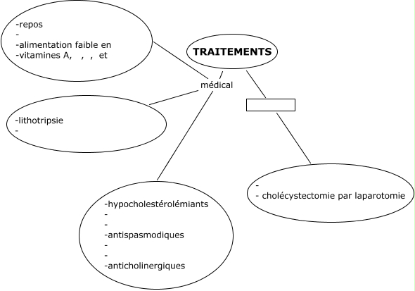 Cette carte de concepts créée avec IHMC CmapTools traite de: Traitements, TRAITEMENTS médical -repos - -alimentation faible en -vitamines A, , , et, TRAITEMENTS médical -hypocholestérolémiants - - -antispasmodiques - - -anticholinergiques, TRAITEMENTS médical -lithotripsie -, TRAITEMENTS médical -hypocholestérolémiants - - -antispasmodiques - - -anticholinergiques, TRAITEMENTS - - cholécystectomie par laparotomie, TRAITEMENTS médical -hypocholestérolémiants - - -antispasmodiques - - -anticholinergiques, TRAITEMENTS médical -repos - -alimentation faible en -vitamines A, , , et, TRAITEMENTS médical -lithotripsie -, TRAITEMENTS médical -lithotripsie -, TRAITEMENTS - - cholécystectomie par laparotomie, TRAITEMENTS - - cholécystectomie par laparotomie, TRAITEMENTS médical -repos - -alimentation faible en -vitamines A, , , et