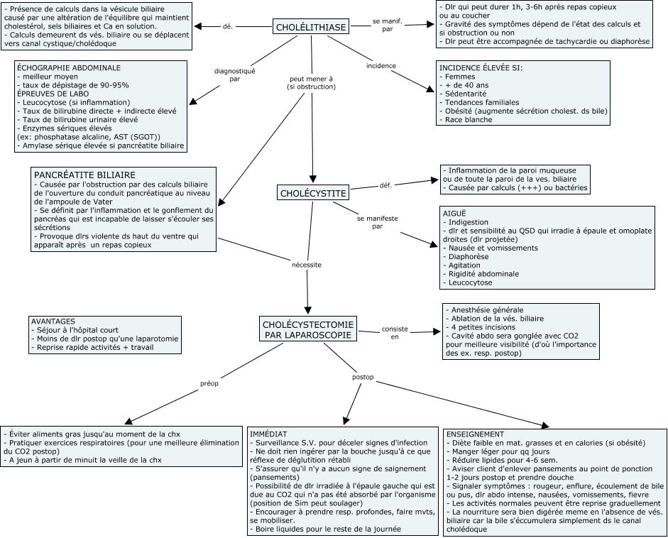 Cette carte de concepts créée avec IHMC CmapTools traite de: cholécystectomiep, CHOLÉLITHIASE incidence INCIDENCE ÉLEVÉE SI: - Femmes - + de 40 ans - Sédentarité - Tendances familiales - Obésité (augmente sécrétion cholest. ds bile) - Race blanche, CHOLÉLITHIASE diagnostiqué par ÉCHOGRAPHIE ABDOMINALE - meilleur moyen - taux de dépistage de 90-95% ÉPREUVES DE LABO - Leucocytose (si inflammation) - Taux de bilirubine directe + indirecte élevé - Taux de bilirubine urinaire élevé - Enzymes sériques élevés (ex: phosphatase alcaline, AST (SGOT)) - Amylase sérique élevée si pancréatite biliaire, CHOLÉCYSTECTOMIE PAR LAPAROSCOPIE postop ENSEIGNEMENT - Diète faible en mat. grasses et en calories (si obésité) - Manger léger pour qq jours - Réduire lipides pour 4-6 sem. - Aviser client d'enlever pansements au point de ponction 1-2 jours postop et prendre douche - Signaler symptômes : rougeur, enflure, écoulement de bile ou pus, dlr abdo intense, nausées, vomissements, fievre - Les activités normales peuvent être reprise graduellement - La nourriture sera bien digérée meme en l'absence de vés. biliaire car la bile s'éccumulera simplement ds le canal cholédoque, CHOLÉLITHIASE se manif. par - Dlr qui peut durer 1h, 3-6h après repas copieux ou au coucher - Gravité des symptômes dépend de l'état des calculs et si obstruction ou non - Dlr peut être accompagnée de tachycardie ou diaphorèse, CHOLÉCYSTECTOMIE PAR LAPAROSCOPIE consiste en - Anesthésie générale - Ablation de la vés. biliaire - 4 petites incisions - Cavité abdo sera gonglée avec CO2 pour meilleure visibilité (d'où l'importance des ex. resp. postop), CHOLÉCYSTITE nécessite CHOLÉCYSTECTOMIE PAR LAPAROSCOPIE, CHOLÉCYSTITE déf. - Inflammation de la paroi muqueuse ou de toute la paroi de la ves. biliaire - Causée par calculs (+++) ou bactéries, CHOLÉLITHIASE dé. - Présence de calculs dans la vésicule biliaire causé par une altération de l'équilibre qui maintient cholestérol, sels biliaires et Ca en solution. - Calculs demeurent ds vés. biliaire ou se déplacent vers canal cystique/cholédoque, CHOLÉCYSTECTOMIE PAR LAPAROSCOPIE postop IMMÉDIAT - Surveillance S.V. pour déceler signes d'infection - Ne doit rien ingérer par la bouche jusqu'à ce que réflexe de déglutition rétabli - S'assurer qu'il n'y a aucun signe de saignement (pansements) - Possibilité de dlr irradiée à l'épaule gauche qui est due au CO2 qui n'a pas été absorbé par l'organisme (position de Sim peut soulager) - Encourager à prendre resp. profondes, faire mvts, se mobiliser. - Boire liquides pour le reste de la journée, CHOLÉCYSTITE se manifeste par AIGUË - Indigestion - dlr et sensibilité au QSD qui irradie à épaule et omoplate droites (dlr projetée) - Nausée et vomissements - Diaphorèse - Agitation - Rigidité abdominale - Leucocytose, PANCRÉATITE BILIAIRE - Causée par l'obstruction par des calculs biliaire de l'ouverture du conduit pancréatique au niveau de l'ampoule de Vater - Se définit par l'inflammation et le gonflement du pancréas qui est incapable de laisser s'écouler ses sécrétions - Provoque dlrs violente ds haut du ventre qui apparaît après un repas copieux nécessite CHOLÉCYSTECTOMIE PAR LAPAROSCOPIE, CHOLÉCYSTECTOMIE PAR LAPAROSCOPIE préop - Éviter aliments gras jusqu'au moment de la chx - Pratiquer exercices respiratoires (pour une meilleure élimination du CO2 postop) - A jeun à partir de minuit la veille de la chx, CHOLÉLITHIASE peut mener à (si obstruction) CHOLÉCYSTITE, CHOLÉLITHIASE peut mener à (si obstruction) PANCRÉATITE BILIAIRE - Causée par l'obstruction par des calculs biliaire de l'ouverture du conduit pancréatique au niveau de l'ampoule de Vater - Se définit par l'inflammation et le gonflement du pancréas qui est incapable de laisser s'écouler ses sécrétions - Provoque dlrs violente ds haut du ventre qui apparaît après un repas copieux