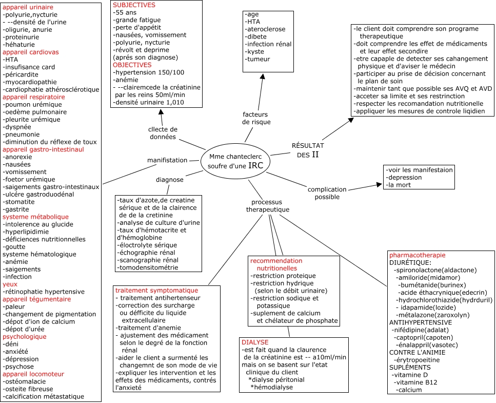 Cette carte de concepts créée avec IHMC CmapTools traite de: IRC, Mme chanteclerc soufre d'une IRC cllecte de données SUBJECTIVES -55 ans -grande fatigue -perte d'appétit -nausées, vomissement -polyurie, nycturie -révolt et deprime (aprés son diagnose) OBJECTIVES -hypertension 150/100 -anémie - --clairemcede la créatinine par les reins 50ml/min -densité urinaire 1,010, Mme chanteclerc soufre d'une IRC manifistation appareil urinaire -polyurie,nycturie - --densité de l'urine -oligurie, anurie -proteinurie -héhaturie appareil cardiovas -HTA -insufisance card -péricardite -myocardiopathie -cardiophatie athérosclérotique appareil respiratoire -poumon urémique -oedème pulmonaire -pleurite urémique -dyspnée -pneumonie -diminution du réflexe de toux appareil gastro-intestinaul -anorexie -nausées -vomissement -foetor urémique -saigements gastro-intestinaux -ulcére gastroduodénal -stomatite -gastrite systeme métabolique -intolerence au glucide -hyperlipidimie -déficiences nutritionnelles -goutte systeme hématologique -anémie -saigements -infection yeux -rétinophatie hypertensive appareil tégumentaire -paleur -changement de pigmentation -dépot d'ion de calcium -dépot d'urée psychologique -déni -anxiété -dépression -psychose appareil locomoteur -ostéomalacie -osteite fibreuse -calcification métastatique, Mme chanteclerc soufre d'une IRC processus therapeutique DIALYSE -est fait quand la claurence de la créatinine est -- a10ml/min mais on se basent sur l'etat clinique du client *dialyse péritonial *hémodialyse, Mme chanteclerc soufre d'une IRC RÉSULTAT DES II -le client doit comprendre son programe therapeutique -doit comprendre les effet de médicaments et leur effet secondire -etre capaple de detecter ses cahangement physique et d'aviser le médecin -participer au prise de décision concernant le plan de soin -maintenir tant que possible ses AVQ et AVD -acceter sa limite et ses restrinction -respecter les recomandation nutritionelle -appliquer les mesures de controle liqidien, Mme chanteclerc soufre d'une IRC diagnose -taux d'azote,de creatine sérique et de la clairence de de la cretinine -analyse de culture d'urine -taux d'hémotacrite et d'hémoglobine -éloctrolyte sérique -échographie rénal -scanographie rénal -tomodensitométrie, Mme chanteclerc soufre d'une IRC processus therapeutique pharmacotherapie DIURÉTIQUE: -spironolactone(aldactone) -amiloride(midamor) -bumétanide(burinex) -acide éthacrynique(edecrin) -hydrochlorothiazide(hydrduril) - idapamide(lozide) -métalazone(zaroxolyn) ANTIHYPERTENSIVE -nifédipine(adalat) -captopril(capoten) -énalappril(vasotec) CONTRE L'ANIMIE -érytropoeitine SUPLÉMENTS -vitamine D -vitamine B12 -calcium, Mme chanteclerc soufre d'une IRC processus therapeutique traitement symptomatique - traitement antihertenseur -correction des surcharge ou défficite du liquide extracellulaire -traitement d'anemie - ajustement des médicament selon le degré de la fonction rénal -aider le client a surmenté les changemnt de son mode de vie -expliquer les intervention et les effets des médicaments, contrés l'anxieté, Mme chanteclerc soufre d'une IRC facteurs de risque -age -HTA -ateroclerose -dibete -infection rénal -kyste -tumeur, Mme chanteclerc soufre d'une IRC complication possible -voir les manifestaion -depression -la mort, Mme chanteclerc soufre d'une IRC processus therapeutique recommendation nutritionelles -restriction proteique -restriction hydrique (selon le débit urinaire) -restriction sodique et potassique -suplement de calcium et chélateur de phosphate