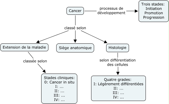 Cette carte de concepts créée avec IHMC CmapTools traite de: cancer, Cancer classé selon Extension de la maladie, Cancer processus de développement Trois stades: Initiation Promotion Progression, Histologie selon différentiation des cellules Quatre grades: I: Légèrement différentiées II: ... III: ... IV: ..., Cancer classé selon Histologie, Extension de la maladie classée selon Stades cliniques: 0: Cancer in situ I: ... II: ... III: ... IV: ..., Cancer classé selon Siège anatomique