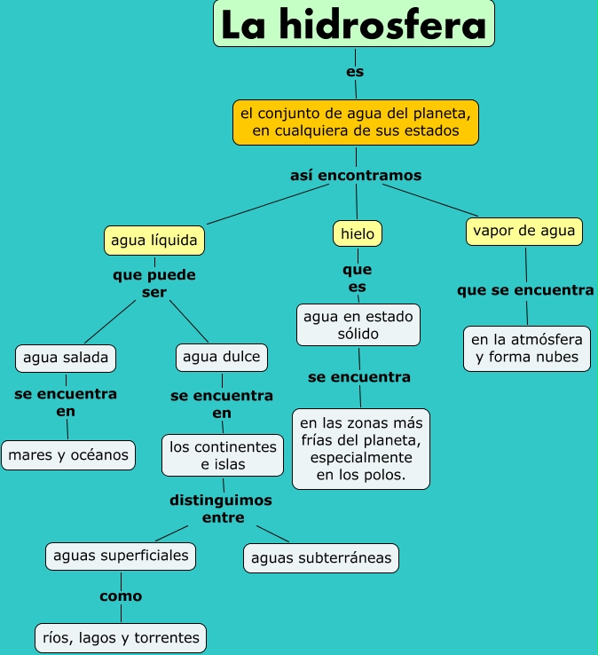 Este Cmap, tiene información relacionada con: La hidrosfera, aguas superficiales como ríos, lagos y torrentes, los continentes e islas distinguimos entre aguas superficiales, el conjunto de agua del planeta, en cualquiera de sus estados así encontramos hielo, La hidrosfera es el conjunto de agua del planeta, en cualquiera de sus estados, agua líquida que puede ser agua salada, agua salada se encuentra en mares y océanos, agua líquida que puede ser agua dulce, el conjunto de agua del planeta, en cualquiera de sus estados así encontramos agua líquida, vapor de agua que se encuentra en la atmósfera y forma nubes, hielo que es agua en estado sólido, el conjunto de agua del planeta, en cualquiera de sus estados así encontramos vapor de agua, agua dulce se encuentra en los continentes e islas, agua en estado sólido se encuentra en las zonas más frías del planeta, especialmente en los polos., los continentes e islas distinguimos entre aguas subterráneas