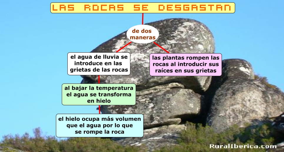 Este Cmap, tiene información relacionada con: Las rocas se desgastan, el agua de lluvia se introduce en las grietas de las rocas al bajar la temperatura el agua se transforma en hielo, Las rocas se desgastan de dos maneras el agua de lluvia se introduce en las grietas de las rocas, al bajar la temperatura el agua se transforma en hielo el hielo ocupa más volumen que el agua por lo que se rompe la roca, Las rocas se desgastan de dos maneras las plantas rompen las rocas al introducir sus raíces en sus grietas
