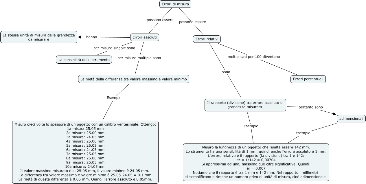 Questa Cmap, creata con IHMC CmapTools, contiene informazioni relative a: Errori di misura, Errori assoluti per misure singole sono La sensibilità dello strumento, Errori di misura possono essere Errori relativi, adimensionali Esempio Misuro la lunghezza di un oggetto che risulta essere 142 mm. Lo strumento ha una sensibilità di 1 mm, quindi anche l'errore assoluto è 1 mm. L'errore relativo è il rapporto (la divisione) tra 1 e 142: er = 1/142 = 0,00704 Si approssima ad una, massimo due cifre significative. Quindi: er = 0,007 Notiamo che il rapporto è tra 1 mm e 142 mm. Nel rapporto i millimetri si semplificano e rimane un numero privo di unità di misura, cioè adimensionale., Errori assoluti per misure multiple sono La metà della differenza tra valore massimo e valore minimo, Errori di misura possono essere Errori assoluti, Errori assoluti hanno La stessa unità di misura della grandezza da misurare, Errori relativi sono Il rapporto (divisione) tra errore assoluto e grandezza misurata., La metà della differenza tra valore massimo e valore minimo Esempio Misuro dieci volte lo spessore di un oggetto con un calibro ventesimale. Ottengo: 1a misura 25.05 mm 2a misura: 25.00 mm 3a misura: 24.05 mm 4a misura: 25.00 mm 5a misura: 25.05 mm 6a misura: 24.05 mm 7a misura: 25.05 mm 8a misura: 25.00 mm 9a misura: 25.05 mm 10a misura: 24.05 mm Il valore massimo misurato è di 25.05 mm, il valore minimo è 24.05 mm. La differenza tra valore massimo e valore minimo è 25.05-24.05 = 0.1 mm La metà di questa differenza è 0.05 mm. Quindi l'errore assoluto è 0.05mm., Il rapporto (divisione) tra errore assoluto e grandezza misurata. Esempio Misuro la lunghezza di un oggetto che risulta essere 142 mm. Lo strumento ha una sensibilità di 1 mm, quindi anche l'errore assoluto è 1 mm. L'errore relativo è il rapporto (la divisione) tra 1 e 142: er = 1/142 = 0,00704 Si approssima ad una, massimo due cifre significative. Quindi: er = 0,007 Notiamo che il rapporto è tra 1 mm e 142 mm. Nel rapporto i millimetri si semplificano e rimane un numero privo di unità di misura, cioè adimensionale., Errori relativi moltiplicati per 100 diventano Errori percentuali, Il rapporto (divisione) tra errore assoluto e grandezza misurata. pertanto sono adimensionali