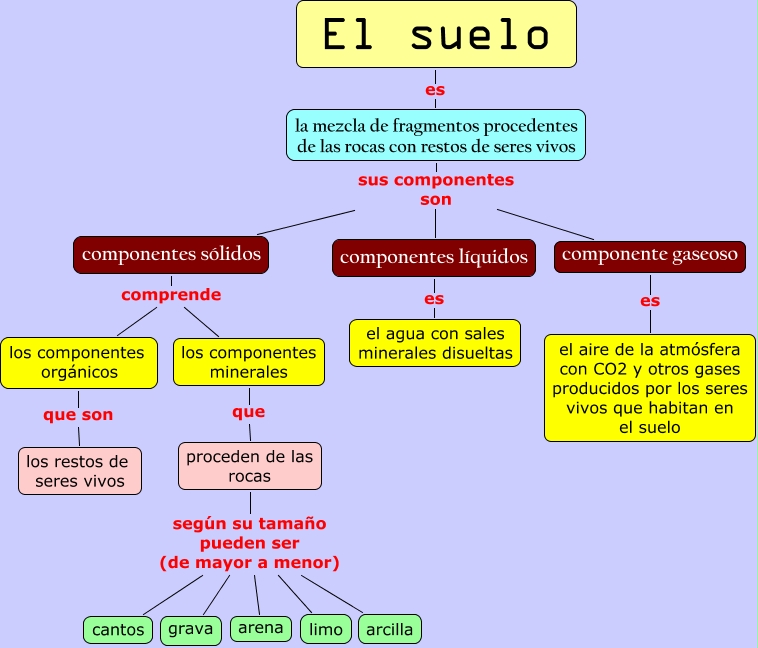 Este Cmap, tiene información relacionada con: El suelo, los componentes orgánicos que son los restos de seres vivos, proceden de las rocas según su tamaño pueden ser (de mayor a menor) cantos, los componentes minerales que proceden de las rocas, proceden de las rocas según su tamaño pueden ser (de mayor a menor) grava, componentes líquidos es el agua con sales minerales disueltas, componentes sólidos comprende los componentes minerales, proceden de las rocas según su tamaño pueden ser (de mayor a menor) arena, proceden de las rocas según su tamaño pueden ser (de mayor a menor) limo, El suelo es la mezcla de fragmentos procedentes de las rocas con restos de seres vivos, la mezcla de fragmentos procedentes de las rocas con restos de seres vivos sus componentes son componente gaseoso, la mezcla de fragmentos procedentes de las rocas con restos de seres vivos sus componentes son componentes sólidos, la mezcla de fragmentos procedentes de las rocas con restos de seres vivos sus componentes son componentes líquidos, proceden de las rocas según su tamaño pueden ser (de mayor a menor) arcilla, componentes sólidos comprende los componentes orgánicos, componente gaseoso es el aire de la atmósfera con CO2 y otros gases producidos por los seres vivos que habitan en el suelo