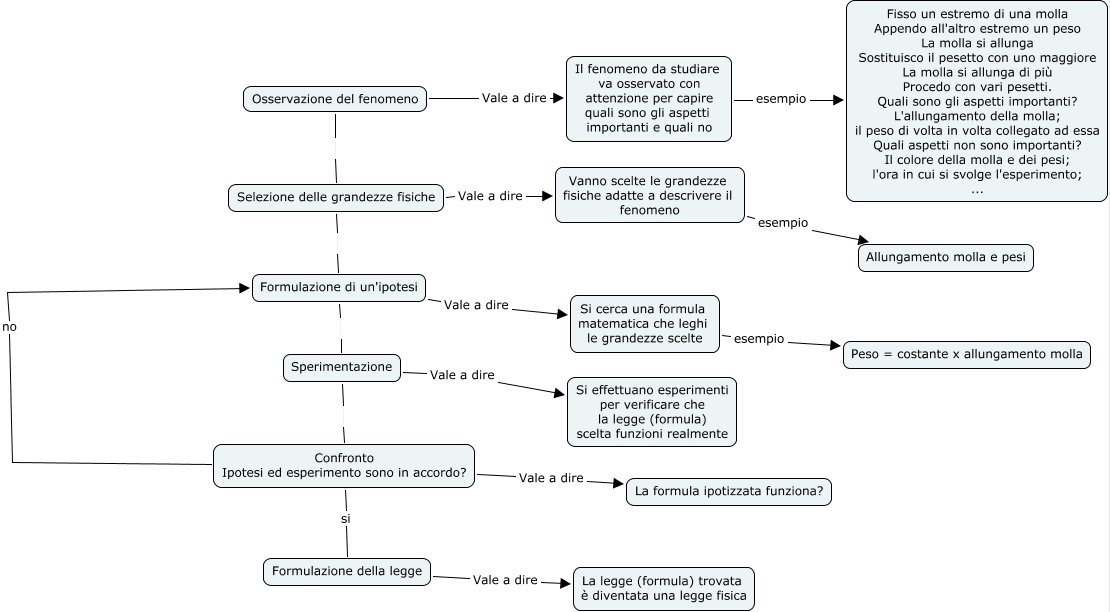 Questa Cmap, creata con IHMC CmapTools, contiene informazioni relative a: Metodo sperimentale, Osservazione del fenomeno Vale a dire Il fenomeno da studiare va osservato con attenzione per capire quali sono gli aspetti importanti e quali no, Sperimentazione Confronto Ipotesi ed esperimento sono in accordo?, Confronto Ipotesi ed esperimento sono in accordo? no Formulazione di un'ipotesi, Selezione delle grandezze fisiche Vale a dire Vanno scelte le grandezze fisiche adatte a descrivere il fenomeno, Il fenomeno da studiare va osservato con attenzione per capire quali sono gli aspetti importanti e quali no esempio Fisso un estremo di una molla Appendo all'altro estremo un peso La molla si allunga Sostituisco il pesetto con uno maggiore La molla si allunga di più Procedo con vari pesetti. Quali sono gli aspetti importanti? L'allungamento della molla; il peso di volta in volta collegato ad essa Quali aspetti non sono importanti? Il colore della molla e dei pesi; l'ora in cui si svolge l'esperimento; ..., Formulazione della legge Vale a dire La legge (formula) trovata è diventata una legge fisica, Osservazione del fenomeno Selezione delle grandezze fisiche, Vanno scelte le grandezze fisiche adatte a descrivere il fenomeno esempio Allungamento molla e pesi, Confronto Ipotesi ed esperimento sono in accordo? si Formulazione della legge, Si cerca una formula matematica che leghi le grandezze scelte esempio Peso = costante x allungamento molla, Sperimentazione Vale a dire Si effettuano esperimenti per verificare che la legge (formula) scelta funzioni realmente, Selezione delle grandezze fisiche Formulazione di un'ipotesi, Confronto Ipotesi ed esperimento sono in accordo? Vale a dire La formula ipotizzata funziona?, Formulazione di un'ipotesi Sperimentazione, Formulazione di un'ipotesi Vale a dire Si cerca una formula matematica che leghi le grandezze scelte