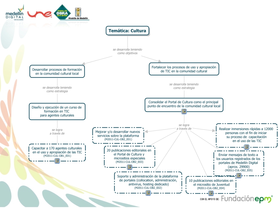 Este Cmap, tiene información relacionada con: Tematica Cultura, Consolidar el Portal de Cultura como el principal punto de encuentro de la comunidad cultural local se logra a través de 10 publicaciones editoriales en el micrositio de Juventud (M2011-CUL-OB2_E04), Consolidar el Portal de Cultura como el principal punto de encuentro de la comunidad cultural local se logra a través de Soporte y administración de la plataforma de portales (collocation, administración, antivirus, hosting dedicado) (M2011-CUL-OB2_E02), Temática: Cultura se desarrolla teniendo como objetivos Desarrollar procesos de formación en la comunidad cultural local, Temática: Cultura se desarrolla teniendo como objetivos Fortalecer los procesos de uso y apropiación de TIC en la comunidad cultural, Consolidar el Portal de Cultura como el principal punto de encuentro de la comunidad cultural local se logra a través de 20 publicaciones editoriales en el Portal de Cultura y micrositios especiales (M2011-CUL-OB2_E03), Diseño y ejecución de un curso de formación en TIC para agentes culturales se logra a través de Capacitar a 170 agentes culturales en el uso y apropiación de las TIC (M2011-CUL-OB1_E01), Consolidar el Portal de Cultura como el principal punto de encuentro de la comunidad cultural local se logra a través de Realizar inmersiones rápidas a 12000 personas con el fin de iniciar su proceso de capacitación en el uso de las TIC, Consolidar el Portal de Cultura como el principal punto de encuentro de la comunidad cultural local se logra a través de Enviar mensajes de texto a los usuarios registrados de los portales de Medellín Digital (aprox. 29900) (M2011-CUL-OB2_E05), Consolidar el Portal de Cultura como el principal punto de encuentro de la comunidad cultural local se logra a través de Mejorar y/o desarrollar nuevos servicios sobre la plataforma (M2011-CUL-OB2_E01), Fortalecer los procesos de uso y apropiación de TIC en la comunidad cultural se desarrolla teniendo como estrategia Consolidar el Portal de Cultura como el principal punto de encuentro de la comunidad cultural local, Desarrollar procesos de formación en la comunidad cultural local se desarrolla teniendo como estrategia Diseño y ejecución de un curso de formación en TIC para agentes culturales