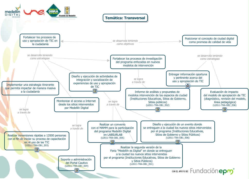 Este Cmap, tiene información relacionada con: Tematica Transversal, Fortalecer los procesos de investigación del programa enfocados en nuevos modelos de intervención se logra a través de Informe de análisis y propuestas de modelos intervención de los espacios de ciudad (Instituciones Educativas, Sitios de Gobierno, Sitios públicos) (U2011-TRA-OB1_E02), Temática: Transversal se desarrolla teniendo como objetivos Posicionar el concepto de ciudad digital como promesa de calidad de vida, Temática: Transversal se desarrolla teniendo como objetivos Fortalecer los procesos de uso y apropiación de TIC en la ciudadanía, Posicionar el concepto de ciudad digital como promesa de calidad de vida se desarrolla teniendo como estrategias Entregar información oportuna y pertinente acerca del uso y apropiación de TIC, Fortalecer los procesos de uso y apropiación de TIC en la ciudadanía se desarrolla teniendo como estrategias Implementar una estrategia itinerante que permita impactar de manera masiva a la ciudadanía, Posicionar el concepto de ciudad digital como promesa de calidad de vida se desarrolla teniendo como estrategias Evaluación de impacto del modelo de apropiación de TIC (diagnóstico, revisión del modelo, línea pedagógica) (U2011-TRA-OB2_E06), Fortalecer los procesos de uso y apropiación de TIC en la ciudadanía se desarrolla teniendo como estrategias Monitorear el acceso a Internet desde los sitios intervenidos por Medellín Digital, Diseño y ejecución de actividades de integración y socialización de experiencias de uso y apropiación de TIC se logra a través de Realizar la segunda versión de la Feria "Medellín es Digital" en donde se entreguen a la ciudad los nuevos sitios intervenidos por el programa (Instituciones Educativas, Sitios de Gobierno y Sitios Públicos) (U2011-TRA-OB1_E01), Fortalecer los procesos de uso y apropiación de TIC en la ciudadanía se desarrolla teniendo como estrategias Diseño y ejecución de actividades de integración y socialización de experiencias de uso y apropiación de TIC, Monitorear el acceso a Internet desde los sitios intervenidos por Medellín Digital se logra a través de Soporte y administración del Portal Cautivo (U2011-TRA-OB1_E04), Diseño y ejecución de actividades de integración y socialización de experiencias de uso y apropiación de TIC se logra a través de Realizar un convenio con el MAMM para la participación del programa Medellín Digital en LABSURLAB (U2011-TRA-OB1_E05), Fortalecer los procesos de uso y apropiación de TIC en la ciudadanía se desarrolla teniendo como estrategias Fortalecer los procesos de investigación del programa enfocados en nuevos modelos de intervención, Implementar una estrategia itinerante que permita impactar de manera masiva a la ciudadanía se logra a través de Realizar inmersiones rápidas a 12000 personas con el fin de iniciar su proceso de capacitación en el uso de las TIC (U2011-TRA-OB1_E03), Diseño y ejecución de actividades de integración y socialización de experiencias de uso y apropiación de TIC se logra a través de Diseño y ejecución de un evento donde se entreguen a la ciudad los nuevos sitios intervenidos por el programa (Instituciones Educativas, Sitios de Gobierno y Sitios Públicos) (U2011-TRA-OB1_E06)