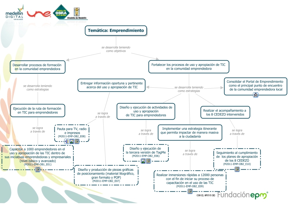 Este Cmap, tiene información relacionada con: Tematica Emprendimiento, Desarrollar procesos de formación en la comunidad emprendedora se desarrolla teniendo como estrategias Ejecución de la ruta de formación en TIC para emprendedores, Fortalecer los procesos de uso y apropiación de TIC en la comunidad emprendedora se desarrolla teniendo como estrategias Consolidar el Portal de Emprendimiento como el principal punto de encuentro de la comunidad emprendedora local, Fortalecer los procesos de uso y apropiación de TIC en la comunidad emprendedora se desarrolla teniendo como estrategias Entregar información oportuna y pertinente acerca del uso y apropiación de TIC, Entregar información oportuna y pertinente acerca del uso y apropiación de TIC se logra a través de Pauta para TV, radio e impresos (M2011-EMP-OB2_E08), Realizar el acompañamiento a los 8 CEDEZO intervenidos se logra a través de Seguimiento al cumplimiento de los planes de apropiación de los 8 CEDEZO (M2011-EMP-OB2_E10), Temática: Emprendimiento se desarrolla teniendo como objetivos Fortalecer los procesos de uso y apropiación de TIC en la comunidad emprendedora, Fortalecer los procesos de uso y apropiación de TIC en la comunidad emprendedora se desarrolla teniendo como estrategias Diseño y ejecución de actividades de uso y apropiación de TIC para emprendedores, Temática: Emprendimiento se desarrolla teniendo como objetivos Desarrollar procesos de formación en la comunidad emprendedora, Ejecución de la ruta de formación en TIC para emprendedores se logra a través de Capacitar a 1000 emprendedores en el uso y apropiación de las TIC dentro de sus iniciativas emprendedoras y empresariales (nivel básico y avanzado) (M2011-EMP-OB1_E01), Diseño y ejecución de actividades de uso y apropiación de TIC para emprendedores se logra a través de Diseño y ejecución de la tercera versión de TagMe (M2011-EMP-OB2_E06), Entregar información oportuna y pertinente acerca del uso y apropiación de TIC se logra a través de Diseño y producción de piezas gráficas de posicionamiento (material litográfico, gran formato y POP) (M2011-EMP-OB2_E07), Fortalecer los procesos de uso y apropiación de TIC en la comunidad emprendedora se desarrolla teniendo como estrategias Realizar el acompañamiento a los 8 CEDEZO intervenidos, Fortalecer los procesos de uso y apropiación de TIC en la comunidad emprendedora se desarrolla teniendo como estrategias Implementar una estrategia itinerante que permita impactar de manera masiva a la ciudadanía, Implementar una estrategia itinerante que permita impactar de manera masiva a la ciudadanía se logra a través de Realizar inmersiones rápidas a 12000 personas con el fin de iniciar su proceso de capacitación en el uso de las TIC (M2011-EMP-OB2_E09)