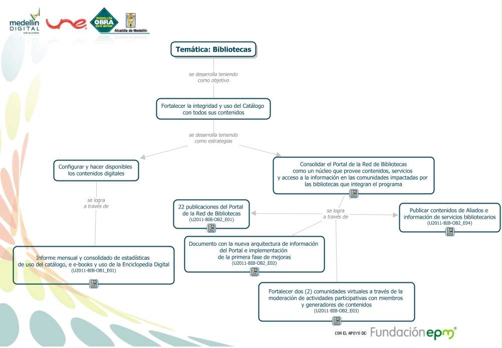 Este Cmap, tiene información relacionada con: Temática Bibliotecas, Configurar y hacer disponibles los contenidos digitales se logra a través de Informe mensual y consolidado de estadísticas de uso del catálogo, e e-books y uso de la Enciclopedia Digital (U2011-BIB-OB1_E01), Consolidar el Portal de la Red de Bibliotecas como un núcleo que provee contenidos, servicios y acceso a la información en las comunidades impactadas por las bibliotecas que integran el programa se logra a través de 22 publicaciones del Portal de la Red de Bibliotecas (U2011-BIB-OB2_E01), Consolidar el Portal de la Red de Bibliotecas como un núcleo que provee contenidos, servicios y acceso a la información en las comunidades impactadas por las bibliotecas que integran el programa se logra a través de Documento con la nueva arquitectura de información del Portal e implementación de la primera fase de mejoras (U2011-BIB-OB2_E02), Consolidar el Portal de la Red de Bibliotecas como un núcleo que provee contenidos, servicios y acceso a la información en las comunidades impactadas por las bibliotecas que integran el programa se logra a través de Publicar contenidos de Aliados e información de servicios bibliotecarios (U2011-BIB-OB2_E04), Fortalecer la integridad y uso del Catálogo con todos sus contenidos se desarrolla teniendo como estrategias Consolidar el Portal de la Red de Bibliotecas como un núcleo que provee contenidos, servicios y acceso a la información en las comunidades impactadas por las bibliotecas que integran el programa, Temática: Bibliotecas se desarrolla teniendo como objetivo Fortalecer la integridad y uso del Catálogo con todos sus contenidos, Consolidar el Portal de la Red de Bibliotecas como un núcleo que provee contenidos, servicios y acceso a la información en las comunidades impactadas por las bibliotecas que integran el programa se logra a través de Fortalecer dos (2) comunidades virtuales a través de la moderación de actividades participativas con miembros y generadores de contenidos (U2011-BIB-OB2_E03), Fortalecer la integridad y uso del Catálogo con todos sus contenidos se desarrolla teniendo como estrategias Configurar y hacer disponibles los contenidos digitales