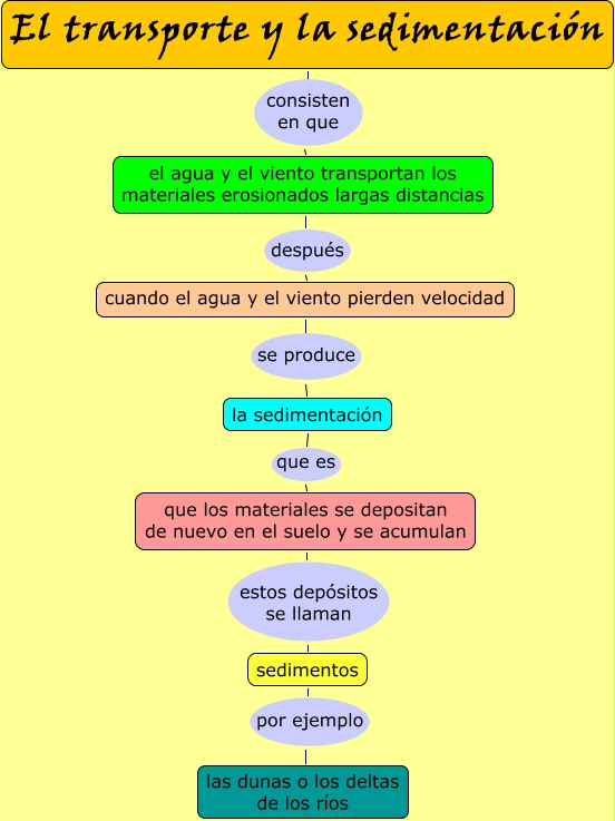 Este Cmap, tiene información relacionada con: El transporte y la sedimentación, El transporte y la sedimentación consisten en que el agua y el viento transportan los materiales erosionados largas distancias, la sedimentación que es que los materiales se depositan de nuevo en el suelo y se acumulan, el agua y el viento transportan los materiales erosionados largas distancias después cuando el agua y el viento pierden velocidad, cuando el agua y el viento pierden velocidad se produce la sedimentación, que los materiales se depositan de nuevo en el suelo y se acumulan estos depósitos se llaman sedimentos, sedimentos por ejemplo las dunas o los deltas de los ríos