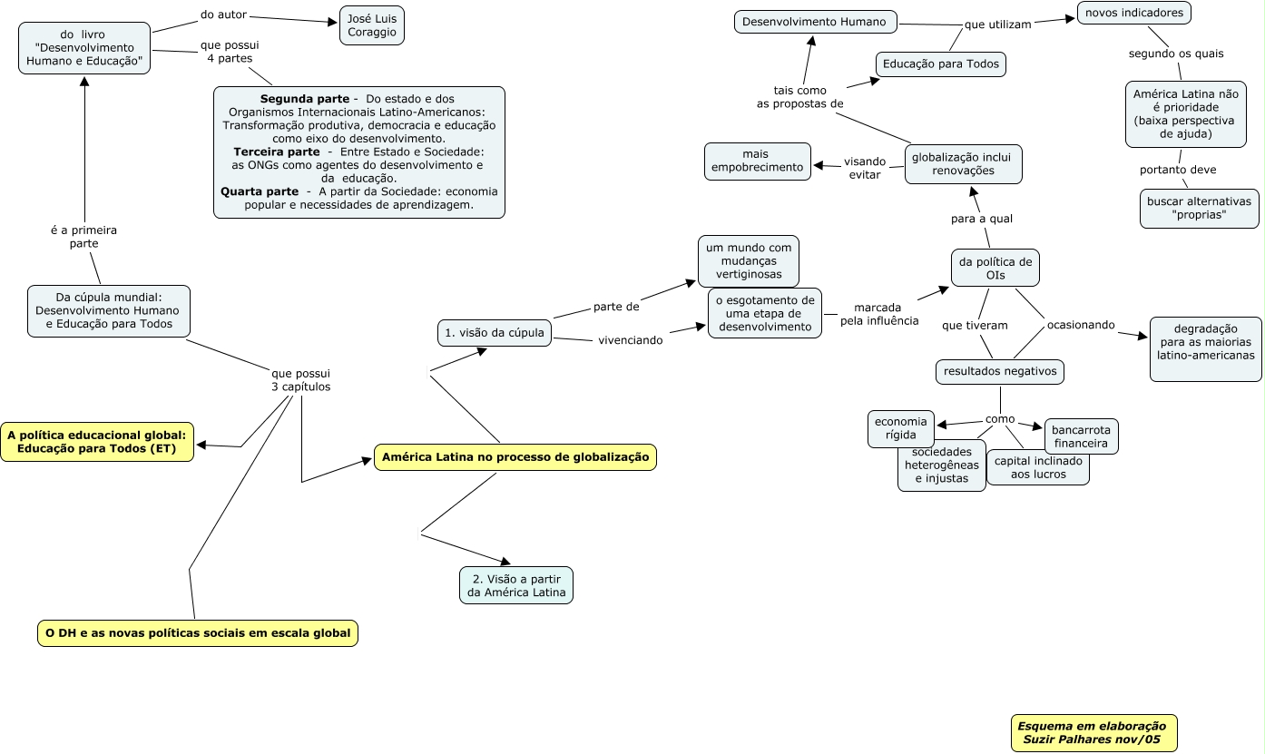 Esse mapa conceitual, produzido no IHMC CmapTools, tem a informação relacionada a: Desenvolvimento Humano e Educação, o esgotamento de uma etapa de desenvolvimento marcada pela influência da política de OIs, América Latina no processo de globalização 2. Visão a partir da América Latina, Educação para Todos que utilizam novos indicadores, da política de OIs para a qual globalização inclui renovações, resultados negativos como bancarrota financeira, globalização inclui renovações tais como as propostas de Desenvolvimento Humano, da política de OIs ocasionando degradação para as maiorias latino-americanas, Da cúpula mundial: Desenvolvimento Humano e Educação para Todos que possui 3 capítulos A política educacional global: Educação para Todos (ET), novos indicadores segundo os quais América Latina não é prioridade (baixa perspectiva de ajuda), da política de OIs que tiveram resultados negativos, América Latina não é prioridade (baixa perspectiva de ajuda) portanto deve buscar alternativas "proprias", Da cúpula mundial: Desenvolvimento Humano e Educação para Todos que possui 3 capítulos América Latina no processo de globalização, resultados negativos como capital inclinado aos lucros, globalização inclui renovações visando evitar mais empobrecimento, resultados negativos como sociedades heterogêneas e injustas, resultados negativos ocasionando degradação para as maiorias latino-americanas, 1. visão da cúpula parte de um mundo com mudanças vertiginosas, do livro "Desenvolvimento Humano e Educação" do autor José Luis Coraggio, do livro "Desenvolvimento Humano e Educação" que possui 4 partes Segunda parte - Do estado e dos Organismos Internacionais Latino-Americanos: Transformação produtiva, democracia e educação como eixo do desenvolvimento. Terceira parte - Entre Estado e Sociedade: as ONGs como agentes do desenvolvimento e da educação. Quarta parte - A partir da Sociedade: economia popular e necessidades de aprendizagem., Da cúpula mundial: Desenvolvimento Humano e Educação para Todos que possui 3 capítulos O DH e as novas políticas sociais em escala global