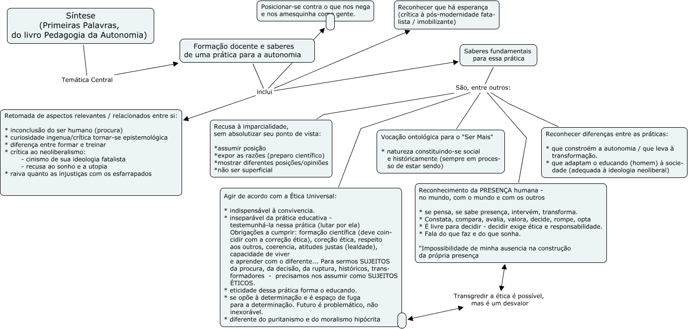 Esse mapa conceitual, produzido no IHMC CmapTools, tem a informação relacionada a: Primeiras Palavras, Saberes fundamentais para essa prática São, entre outros: Agir de acordo com a Ética Universal: * indispensável à convivencia. * inseparável da prática educativa - testemunhá-la nessa prática (lutar por ela) Obrigações a cumprir: formação científica (deve coin- cidir com a correção ética), coreção ética, respeito aos outros, coerencia, atitudes justas (lealdade), capacidade de viver e aprender com o diferente... Para sermos SUJEITOS da procura, da decisão, da ruptura, históricos, trans- formadores - precisamos nos assumir como SUJEITOS ÉTICOS. * eticidade dessa prática forma o educando. * se opõe à determinação e é espaço de fuga para a determinação. Futuro é problemático, não inexorável. * diferente do puritanismo e do moralismo hipócrita, Saberes fundamentais para essa prática São, entre outros: Recusa à imparcialidade, sem absolutizar seu ponto de vista: *assumir posição *expor as razões (preparo científico) *mostrar diferentes posições/opiniões *não ser superficial, Saberes fundamentais para essa prática São, entre outros: Vocação ontológica para o "Ser Mais" * natureza constituindo-se social e históricamente (sempre em proces- so de estar sendo), Formação docente e saberes de uma prática para a autonomia inclui, Formação docente e saberes de uma prática para a autonomia inclui Reconhecer que há esperança (crítica à pós-modernidade fata- lista / imobilizante), Saberes fundamentais para essa prática São, entre outros: Reconhecimento da PRESENÇA humana - no mundo, com o mundo e com os outros * se pensa, se sabe presença, intervém, transforma. * Constata, compara, avalia, valora, decide, rompe, opta * É livre para decidir - decidir exige ética e responsabilidade. * Fala do que faz e do que sonha. "Impossibilidade de minha ausencia na construção da própria presença, Formação docente e saberes de uma prática para a autonomia inclui Retomada de aspectos relevantes / relacionados entre si: * inconclusão do ser humano (procura) * curiosidade ingenua/crítica tornar-se epistemológica * diferença entre formar e treinar * crítica ao neoliberalismo: - cinismo de sua ideologia fatalista - recusa ao sonho e a utopia * raiva quanto as injustiças com os esfarrapados, Reconhecimento da PRESENÇA humana - no mundo, com o mundo e com os outros * se pensa, se sabe presença, intervém, transforma. * Constata, compara, avalia, valora, decide, rompe, opta * É livre para decidir - decidir exige ética e responsabilidade. * Fala do que faz e do que sonha. "Impossibilidade de minha ausencia na construção da própria presença Transgredir a ética é possível, mas é um desvalor, Síntese (Primeiras Palavras, do livro Pedagogia da Autonomia) Temática Central Formação docente e saberes de uma prática para a autonomia, Formação docente e saberes de uma prática para a autonomia inclui Saberes fundamentais para essa prática, Saberes fundamentais para essa prática São, entre outros: Reconhecer diferenças entre as práticas: * que constroém a autonomia / que leva à transformação. * que adaptam o educando (homem) à socie- dade (adequada à ideologia neoliberal)