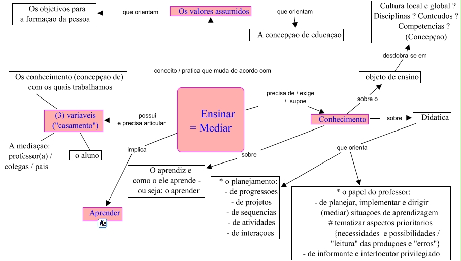 Esse mapa conceitual, produzido no IHMC CmapTools, tem a informação relacionada a: Ensinar, Didatica que orienta * o papel do professor: - de planejar, implementar e dirigir (mediar) situaçoes de aprendizagem # tematizar aspectos prioritarios {necessidades e possibilidades / "leitura" das produçoes e "erros"} - de informante e interlocutor privilegiado, Ensinar = Mediar possui e precisa articular (3) variaveis ("casamento"), Ensinar = Mediar precisa de / exige / supoe Conhecimento, Os valores assumidos que orientam Os objetivos para a formaçao da pessoa, Conhecimento sobre O aprendiz e como o ele aprende - ou seja: o aprender, Conhecimento sobre Didatica, Didatica que orienta * o planejamento: - de progressoes - de projetos - de sequencias - de atividades - de interaçoes, Ensinar = Mediar conceito / pratica que muda de acordo com Os valores assumidos, (3) variaveis ("casamento") ???? A mediaçao: professor(a) / colegas / pais, Conhecimento sobre o objeto de ensino, objeto de ensino desdobra-se em Cultura local e global ? Disciplinas ? Conteudos ? Competencias ? (Concepçao), (3) variaveis ("casamento") ???? Os conhecimento (concepçao de) com os quais trabalhamos, Os valores assumidos que orientam A concepçao de educaçao, Ensinar = Mediar implica Aprender, (3) variaveis ("casamento") ???? o aluno