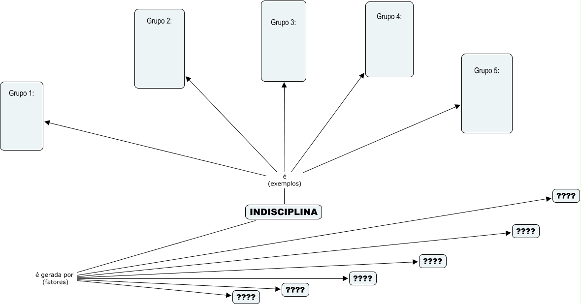 Esse mapa conceitual, produzido no IHMC CmapTools, tem a informação relacionada a: Indisciplina (estudo setorial), INDISCIPLINA é gerada por (fatores) ????, INDISCIPLINA é (exemplos) Grupo 5:, INDISCIPLINA é gerada por (fatores) ????, INDISCIPLINA é gerada por (fatores) ????, INDISCIPLINA é (exemplos) Grupo 2:, INDISCIPLINA é (exemplos) Grupo 4:, INDISCIPLINA é gerada por (fatores) ????, INDISCIPLINA é gerada por (fatores) ????, INDISCIPLINA é (exemplos) Grupo 1:, INDISCIPLINA é (exemplos) Grupo 3:, INDISCIPLINA é gerada por (fatores) ????