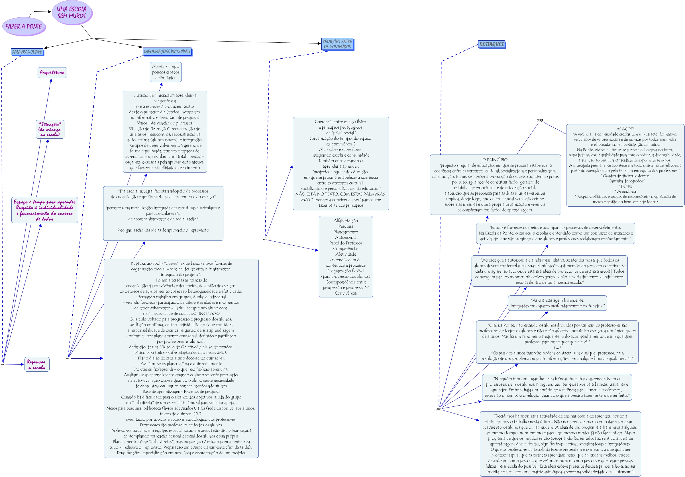 Esse mapa conceitual, produzido no IHMC CmapTools, tem a informação relacionada a: Uma escola sem muros, INFORMAÇÕES PRINCIPAIS xxx Situação de "Iniciação": aprendem a ser gente e a ler e a escrever / produzem textos desde o primeiro dia (textos inventados ou informativos (resultam de pesquisa). Maior intervenção do professor, Situação de "transição": reconstrução de itinerários, reencontros, reconstrução da auto-estima (alunos novos) e integração "Grupos de desenvolvimento": gerem, de forma equilibrada, tempos e espaços de aprendizagem, circulam com total liberdade, organizam-se mais pela aprovimação afetiva, que favorece estabilidade e crescimento, PALAVRAS-CHAVE xxx Repensar a escola, PALAVRAS-CHAVE xxx Arquitetura, UMA ESCOLA SEM MUROS xxx RELAÇÕES ENTRE OS CONTEÚDOS, UMA ESCOLA SEM MUROS xxx PALAVRAS-CHAVE, DESTAQUES XXX "Acresce que a autonomia é ainda mais relativa, se atendermos a que todos os alunos devem contemplar nas suas planificações a dimensão do projecto colectivo. Se cada um agisse isolado, onde estaria a ideia de projecto, onde estaria a escola? Todos convergem para os mesmos objectivos gerais, senão haveria diferentes e indiferentes escolas dentro de uma mesma escola.", DESTAQUES XXX "Decidimos harmonizar a actividade de ensinar com a de aprender, pondo a tónica do nosso trabalho nesta última. Não nos preocupamos com o dar o programa, porque são os alunos que o... aprendem. A ideia de um programa a transmitir a alguém, ao mesmo tempo, num mesmo espaço, do mesmo modo, já não faz sentido. Mas o programa de que os miúdos se vão apropriando faz sentido. Faz sentido a ideia de aprendizagens diversificadas, significativas, activas, socializadoras e integradoras. O que os professores da Escola da Ponte pretendem é o mesmo a que qualquer professor aspira: que as crianças aprendam mais, que aprendam melhor, que se descubram como pessoas, que vejam os outros como pessoas e que sejam pessoas felizes, na medida do possível. Esta ideia esteve presente desde a primeira hora, ao ser inscrita no projecto uma matriz axiológica assente na solidariedade e na autonomia, DESTAQUES XXX O PRINCÍPIO "projecto singular de educação, em que se procura estabelecer a coerência entre as vertentes cultural, socializadora e personalizadora da educação. É que, se a própria promoção do sucesso académico pode, por si só, igualmente constituir factor gerador de estabilidade emocional e de integração social, a atenção que se preconiza para as duas últimas vertentes implica, desde logo, que o acto educativo se direccione sobre elas mesmas e que a própria organização e vivência se constituam em factor de aprendizagem., FAZER A PONTE UMA ESCOLA SEM MUROS, RELAÇÕES ENTRE OS CONTEÚDOS xxx Alfabetização Pesquisa Planejamento Autonomia Papel do Professor Competências Afetividade Aprendizagem de conteúdos e processos Programação flexível (para progresso dos alunos) Correspondência entre progressão e progresso ??? Convivência, DESTAQUES XXX "As crianças agem livremente, integradas em espaços profundamente estruturados.", DESTAQUES XXX "Educar é fornecer os meios e acompanhar processos de desenvolvimento. Na Escola da Ponte, o currículo escolar é entendido como um conjunto de situações e actividades que vão surgindo e que alunos e professores reelaboram conjuntamente.", PALAVRAS-CHAVE xxx "Situações" (da criança na escola), O PRINCÍPIO "projecto singular de educação, em que se procura estabelecer a coerência entre as vertentes cultural, socializadora e personalizadora da educação. É que, se a própria promoção do sucesso académico pode, por si só, igualmente constituir factor gerador de estabilidade emocional e de integração social, a atenção que se preconiza para as duas últimas vertentes implica, desde logo, que o acto educativo se direccione sobre elas mesmas e que a própria organização e vivência se constituam em factor de aprendizagem. GERA AS AÇÕES "A vivência na comunidade escolar tem um carácter formativo, veiculador de valores sociais e de normas por todos assumidas e elaboradas com a participação de todos. Na Ponte, vivese, cultivase, respirase a delicadeza no trato, suavidade na voz, a afabilidade para com o colega, a disponibilidade, a atenção ao outro, a capacidade de expor e de se expor. A interajuda permanente acontece em todo o sistema de relações, a partir do exemplo dado pelo trabalho em equipa dos professores." * Quadro de direitos e deveres * Caixinha de segredos" * Debate * Assembléia * Responsabilidades e grupos de responsáveis (organização de meios e gestão do bem-estar de todos), INFORMAÇÕES PRINCIPAIS xxx Aberta / ampla poucos espaços delimitados, PALAVRAS-CHAVE xxx Espaço e tempo para aprender Respeito à individualidade e favorecimento do sucesso de todos, UMA ESCOLA SEM MUROS xxx INFORMAÇÕES PRINCIPAIS, RELAÇÕES ENTRE OS CONTEÚDOS xxx Coerência entre espaço físico e princípios pedagógicos de "práxis social" (organização do tempo, do espaço, da convivência ) Aliar saber e saber fazer, integrando escola e comunidade. Também considerando o aprender a aprender. "projecto singular de educação, em que se procura estabelecer a coerência entre as vertentes cultural, socializadora e personalizadora da educação." NÃO ESTÁ NO TEXTO, COM ESTAS PALAVRAS, MAS "aprender a conviver e a ser" parece-me fazer parte dos princípios, DESTAQUES XXX "Ninguém tem um lugar fixo para brincar, trabalhar e aprender. Nem os professores, nem os alunos. Ninguém tem tempos fixos para brincar, trabalhar e aprender. Embora haja um horário de referência para alunos e professores, estes não olham para o relógio, quando o que é preciso fazer-se tem de ser feito.", INFORMAÇÕES PRINCIPAIS xxx "Dia escolar integral facilita a adopção de processos de organização e gestão participada do tempo e do espaço" "permite uma mobilização integrada das estruturas curricu