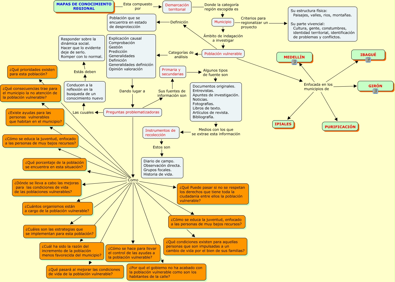 Este Cmap, tiene información relacionada con: Mapa Conocimiento Regional, Documentos originales. Entrevistas. Apuntes de investigación. Noticias. Fotografias. Libros de texto. Artículos de revista. Bibliografía. Medios con los que se extrae esta información Instrumentos de recolección, Población vulnerable Enfocada en los municipios de PURIFICACIÓN, Población vulnerable Enfocada en los municipios de IPIALES, Preguntas problematizadoras Como ¿Qué condiciones existen para aquellas personas que son impulsadas a un cambio de vida por el bien de sus familias?, Preguntas problematizadoras Como ¿Cuál ha sido la razón del incremento de la población menos favorecida del municipio?, Demarcación territorial Donde la categoría región escogida es Municipio, Preguntas problematizadoras Como ¿Cómo se educa la juventud, enfocado a las personas de muy bajos recursos?, Conducen a la reflexión en la busqueda de un conocimiento nuevo Estás deben Responder sobre la dinámica social. Hacer que lo evidente deje de serlo. Romper con lo normal., Preguntas problematizadoras Como ¿Qué porcentaje de la población se encuentra en esta situación?, Preguntas problematizadoras Como ¿Dónde se lleva a cabo las mejoras para las condiciones de vida de las poblaciones vulnerables?, Población vulnerable Enfocada en los municipios de MEDELLÍN, Población vulnerable Definición Población que se encuentra en estado de desprotección, Municipio Ámbito de indagación a investigar Población vulnerable, MAPAS DE CONOCIMIENTO REGIONAL Esta compuesto por Demarcación territorial, Población vulnerable Categorías de análisis Explicación causal Comprobación Gestión Predicción Generalidades Definición Generalidades definición Opinión valoración, Preguntas problematizadoras Como ¿Existe ayudas para las personas vulnerables que habitan en el municipio?, Primaria y secundarias Algunos tipos de fuente son Documentos originales. Entrevistas. Apuntes de investigación. Noticias. Fotografias. Libros de texto. Artículos de revista. Bibliografía., Preguntas problematizadoras Sus fuentes de información son Primaria y secundarias, Instrumentos de recolección Estos son Diario de campo. Observación directa. Grupos focales. Historia de vida., Preguntas problematizadoras Como ¿Qué consecuencias trae para el municipio la no atención de la población vulnerable?