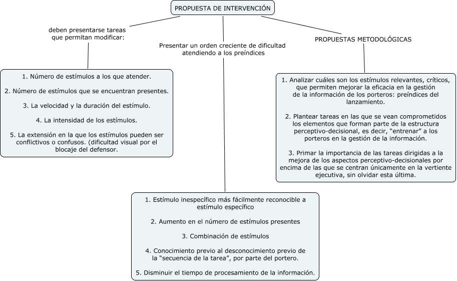Este Cmap, tiene información relacionada con: PROPUESTA DE INTERVENCIÓN, PROPUESTA DE INTERVENCIÓN Presentar un orden creciente de dificultad atendiendo a los preíndices 1. Estímulo inespecífico más fácilmente reconocible a estímulo específico 2. Aumento en el número de estímulos presentes 3. Combinación de estímulos 4. Conocimiento previo al desconocimiento previo de la “secuencia de la tarea”, por parte del portero. 5. Disminuir el tiempo de procesamiento de la información., PROPUESTA DE INTERVENCIÓN deben presentarse tareas que permitan modificar: 1. Número de estímulos a los que atender. 2. Número de estímulos que se encuentran presentes. 3. La velocidad y la duración del estímulo. 4. La intensidad de los estímulos. 5. La extensión en la que los estímulos pueden ser conflictivos o confusos. (dificultad visual por el blocaje del defensor., PROPUESTA DE INTERVENCIÓN PROPUESTAS METODOLÓGICAS 1. Analizar cuáles son los estímulos relevantes, críticos, que permiten mejorar la eficacia en la gestión de la información de los porteros: preíndices del lanzamiento. 2. Plantear tareas en las que se vean comprometidos los elementos que forman parte de la estructura perceptivo-decisional, es decir, “entrenar” a los porteros en la gestión de la información. 3. Primar la importancia de las tareas dirigidas a la mejora de los aspectos perceptivo-decisionales por encima de las que se centran únicamente en la vertiente ejecutiva, sin olvidar esta última.