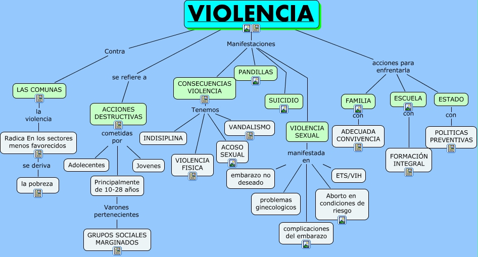 Este Cmap, tiene información relacionada con: VIOLENCIA EN LAS COMUNAS MCR, ACCIONES DESTRUCTIVAS cometidas por Jovenes, ESTADO con POLITICAS PREVENTIVAS, VIOLENCIA se refiere a ACCIONES DESTRUCTIVAS, CONSECUENCIAS VIOLENCIA Tenemos VIOLENCIA FISICA, VIOLENCIA SEXUAL manifestada en problemas ginecologicos, VIOLENCIA acciones para enfrentarla ESTADO, ESCUELA con FORMACIÓN INTEGRAL, ACCIONES DESTRUCTIVAS cometidas por Adolecentes, VIOLENCIA Manifestaciones SUICIDIO, FAMILIA con ADECUADA CONVIVENCIA, VIOLENCIA Manifestaciones PANDILLAS, VIOLENCIA SEXUAL manifestada en embarazo no deseado, VIOLENCIA acciones para enfrentarla ESCUELA, VIOLENCIA SEXUAL manifestada en Aborto en condiciones de riesgo, VIOLENCIA Manifestaciones VIOLENCIA SEXUAL, LAS COMUNAS la violencia Radica En los sectores menos favorecidos, Radica En los sectores menos favorecidos se deriva la pobreza, ACCIONES DESTRUCTIVAS cometidas por Principalmente de 10-28 años, CONSECUENCIAS VIOLENCIA Tenemos ACOSO SEXUAL, Principalmente de 10-28 años Varones pertenecientes GRUPOS SOCIALES MARGINADOS