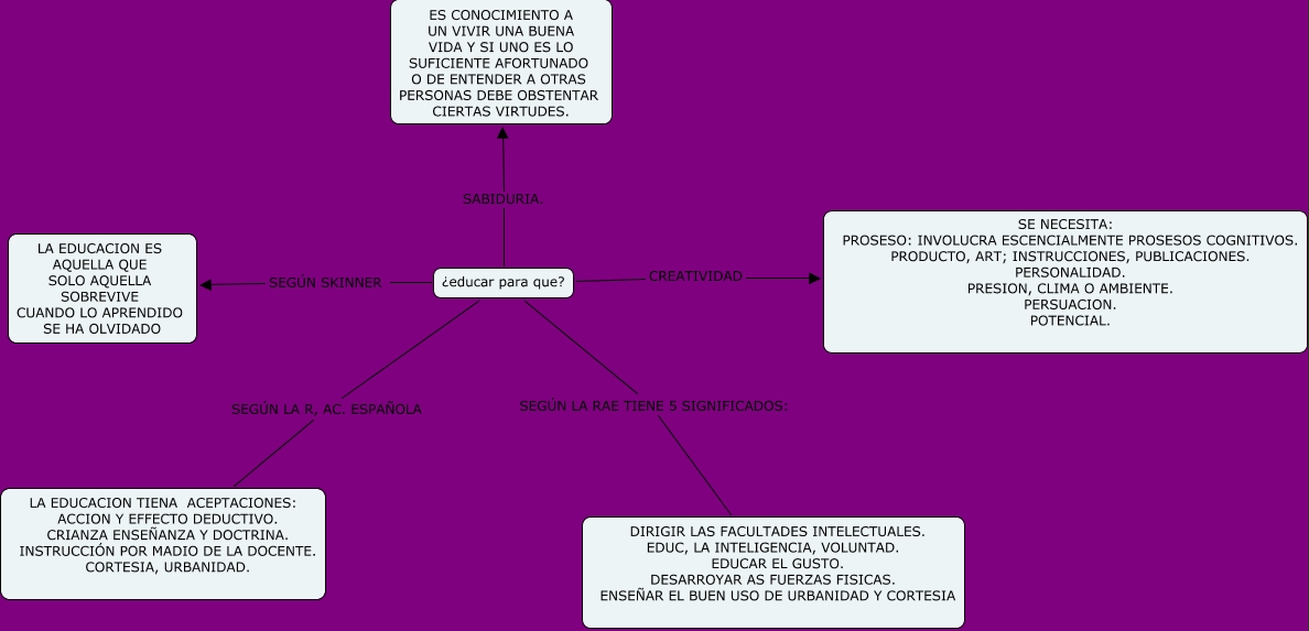 Este Cmap, tiene información relacionada con: cap. 8, ¿educar para que? SEGÚN LA RAE TIENE 5 SIGNIFICADOS: DIRIGIR LAS FACULTADES INTELECTUALES. EDUC, LA INTELIGENCIA, VOLUNTAD. EDUCAR EL GUSTO. DESARROYAR AS FUERZAS FISICAS. ENSEÑAR EL BUEN USO DE URBANIDAD Y CORTESIA, ¿educar para que? SEGÚN LA R, AC. ESPAÑOLA LA EDUCACION TIENA ACEPTACIONES: ACCION Y EFFECTO DEDUCTIVO. CRIANZA ENSEÑANZA Y DOCTRINA. INSTRUCCIÓN POR MADIO DE LA DOCENTE. CORTESIA, URBANIDAD., ¿educar para que? SABIDURIA. ES CONOCIMIENTO A UN VIVIR UNA BUENA VIDA Y SI UNO ES LO SUFICIENTE AFORTUNADO O DE ENTENDER A OTRAS PERSONAS DEBE OBSTENTAR CIERTAS VIRTUDES., ¿educar para que? SEGÚN SKINNER LA EDUCACION ES AQUELLA QUE SOLO AQUELLA SOBREVIVE CUANDO LO APRENDIDO SE HA OLVIDADO, ¿educar para que? CREATIVIDAD SE NECESITA: PROSESO: INVOLUCRA ESCENCIALMENTE PROSESOS COGNITIVOS. PRODUCTO, ART; INSTRUCCIONES, PUBLICACIONES. PERSONALIDAD. PRESION, CLIMA O AMBIENTE. PERSUACION. POTENCIAL.