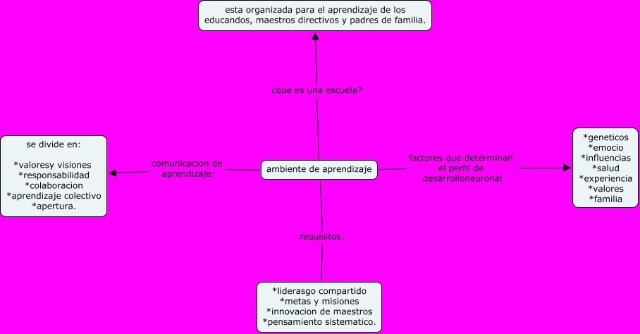 Este Cmap, tiene información relacionada con: cap. 9, ambiente de aprendizaje comunicacion de aprendizaje: se divide en: *valoresy visiones *responsabilidad *colaboracion *aprendizaje colectivo *apertura., ambiente de aprendizaje ¿que es una escuela? esta organizada para el aprendizaje de los educandos, maestros directivos y padres de familia., ambiente de aprendizaje factores que determinan el perfil de desarrolloneuronal *geneticos *emocio *influencias *salud *experiencia *valores *familia, ambiente de aprendizaje requisitos: *liderasgo compartido *metas y misiones *innovacion de maestros *pensamiento sistematico.