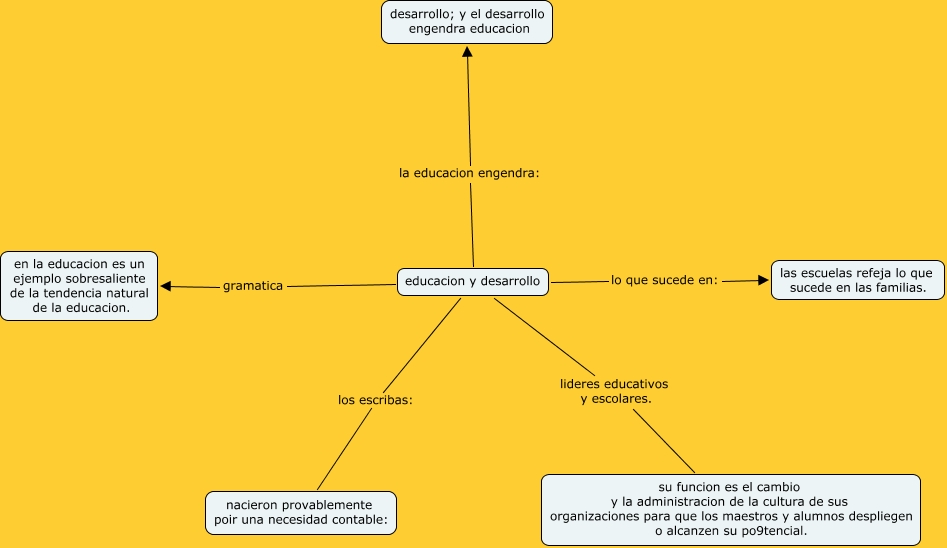Este Cmap, tiene información relacionada con: cap. 3, educacion y desarrollo los escribas: nacieron provablemente poir una necesidad contable:, educacion y desarrollo gramatica en la educacion es un ejemplo sobresaliente de la tendencia natural de la educacion., educacion y desarrollo lideres educativos y escolares. su funcion es el cambio y la administracion de la cultura de sus organizaciones para que los maestros y alumnos despliegen o alcanzen su po9tencial., educacion y desarrollo lo que sucede en: las escuelas refeja lo que sucede en las familias., educacion y desarrollo la educacion engendra: desarrollo; y el desarrollo engendra educacion