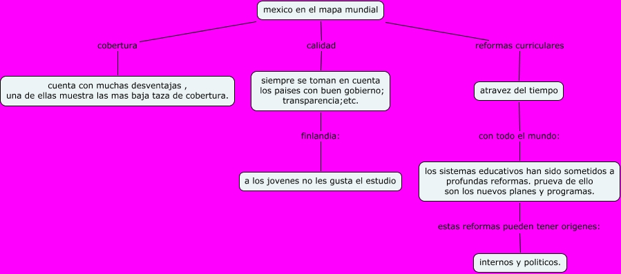 Este Cmap, tiene información relacionada con: capitulo 1, mexico en el mapa mundial reformas curriculares atravez del tiempo, atravez del tiempo con todo el mundo: los sistemas educativos han sido sometidos a profundas reformas. prueva de ello son los nuevos planes y programas., los sistemas educativos han sido sometidos a profundas reformas. prueva de ello son los nuevos planes y programas. estas reformas pueden tener origenes: internos y politicos., mexico en el mapa mundial calidad siempre se toman en cuenta los paises con buen gobierno; transparencia;etc., mexico en el mapa mundial cobertura cuenta con muchas desventajas , una de ellas muestra las mas baja taza de cobertura., siempre se toman en cuenta los paises con buen gobierno; transparencia;etc. finlandia: a los jovenes no les gusta el estudio