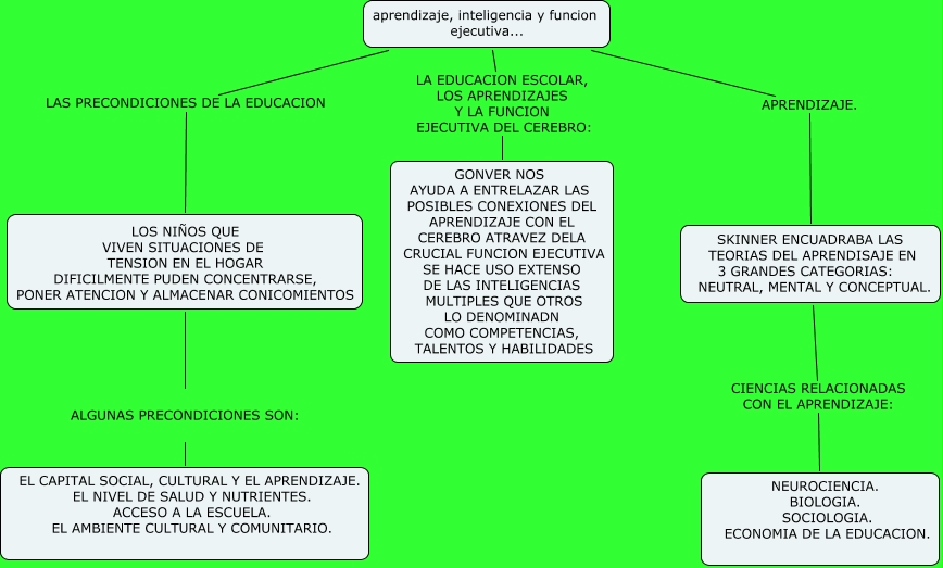 Este Cmap, tiene información relacionada con: cap. 7, LOS NIÑOS QUE VIVEN SITUACIONES DE TENSION EN EL HOGAR DIFICILMENTE PUDEN CONCENTRARSE, PONER ATENCION Y ALMACENAR CONICOMIENTOS ALGUNAS PRECONDICIONES SON: EL CAPITAL SOCIAL, CULTURAL Y EL APRENDIZAJE. EL NIVEL DE SALUD Y NUTRIENTES. ACCESO A LA ESCUELA. EL AMBIENTE CULTURAL Y COMUNITARIO., aprendizaje, inteligencia y funcion ejecutiva... LAS PRECONDICIONES DE LA EDUCACION LOS NIÑOS QUE VIVEN SITUACIONES DE TENSION EN EL HOGAR DIFICILMENTE PUDEN CONCENTRARSE, PONER ATENCION Y ALMACENAR CONICOMIENTOS, aprendizaje, inteligencia y funcion ejecutiva... LA EDUCACION ESCOLAR, LOS APRENDIZAJES Y LA FUNCION EJECUTIVA DEL CEREBRO: GONVER NOS AYUDA A ENTRELAZAR LAS POSIBLES CONEXIONES DEL APRENDIZAJE CON EL CEREBRO ATRAVEZ DELA CRUCIAL FUNCION EJECUTIVA SE HACE USO EXTENSO DE LAS INTELIGENCIAS MULTIPLES QUE OTROS LO DENOMINADN COMO COMPETENCIAS, TALENTOS Y HABILIDADES, aprendizaje, inteligencia y funcion ejecutiva... APRENDIZAJE. SKINNER ENCUADRABA LAS TEORIAS DEL APRENDISAJE EN 3 GRANDES CATEGORIAS: NEUTRAL, MENTAL Y CONCEPTUAL., SKINNER ENCUADRABA LAS TEORIAS DEL APRENDISAJE EN 3 GRANDES CATEGORIAS: NEUTRAL, MENTAL Y CONCEPTUAL. CIENCIAS RELACIONADAS CON EL APRENDIZAJE: NEUROCIENCIA. BIOLOGIA. SOCIOLOGIA. ECONOMIA DE LA EDUCACION.
