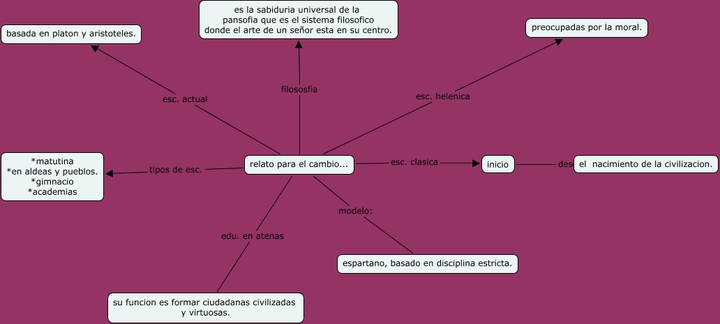 Este Cmap, tiene información relacionada con: cap. 4, relato para el cambio... tipos de esc. *matutina *en aldeas y pueblos. *gimnacio *academias, relato para el cambio... edu. en atenas su funcion es formar ciudadanas civilizadas y virtuosas., relato para el cambio... filososfia es la sabiduria universal de la pansofia que es el sistema filosofico donde el arte de un señor esta en su centro., relato para el cambio... esc. actual basada en platon y aristoteles., inicio desde: el nacimiento de la civilizacion., relato para el cambio... esc. helenica preocupadas por la moral., relato para el cambio... modelo: espartano, basado en disciplina estricta., relato para el cambio... esc. clasica inicio