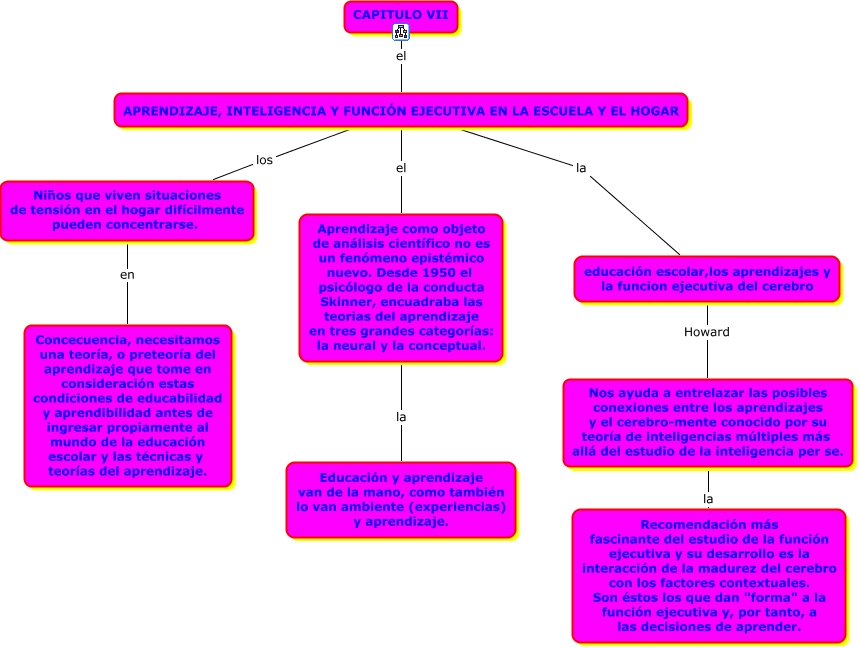 Este Cmap, tiene información relacionada con: CAPITULO VII, APRENDIZAJE, INTELIGENCIA Y FUNCIÓN EJECUTIVA EN LA ESCUELA Y EL HOGAR el Aprendizaje como objeto de análisis científico no es un fenómeno epistémico nuevo. Desde 1950 el psicólogo de la conducta Skinner, encuadraba las teorias del aprendizaje en tres grandes categorías: la neural y la conceptual., Nos ayuda a entrelazar las posibles conexiones entre los aprendizajes y el cerebro-mente conocido por su teoría de inteligencias múltiples más allá del estudio de la inteligencia per se. la Recomendación más fascinante del estudio de la función ejecutiva y su desarrollo es la interacción de la madurez del cerebro con los factores contextuales. Son éstos los que dan "forma" a la función ejecutiva y, por tanto, a las decisiones de aprender., educación escolar,los aprendizajes y la funcion ejecutiva del cerebro Howard Nos ayuda a entrelazar las posibles conexiones entre los aprendizajes y el cerebro-mente conocido por su teoría de inteligencias múltiples más allá del estudio de la inteligencia per se., Aprendizaje como objeto de análisis científico no es un fenómeno epistémico nuevo. Desde 1950 el psicólogo de la conducta Skinner, encuadraba las teorias del aprendizaje en tres grandes categorías: la neural y la conceptual. la Educación y aprendizaje van de la mano, como también lo van ambiente (experiencias) y aprendizaje., Niños que viven situaciones de tensión en el hogar difícilmente pueden concentrarse. en Concecuencia, necesitamos una teoría, o preteoría del aprendizaje que tome en consideración estas condiciones de educabilidad y aprendibilidad antes de ingresar propiamente al mundo de la educación escolar y las técnicas y teorías del aprendizaje., APRENDIZAJE, INTELIGENCIA Y FUNCIÓN EJECUTIVA EN LA ESCUELA Y EL HOGAR los Niños que viven situaciones de tensión en el hogar difícilmente pueden concentrarse., CAPITULO VII el APRENDIZAJE, INTELIGENCIA Y FUNCIÓN EJECUTIVA EN LA ESCUELA Y EL HOGAR, APRENDIZAJE, INTELIGENCIA Y FUNCIÓN EJECUTIVA EN LA ESCUELA Y EL HOGAR la educación escolar,los aprendizajes y la funcion ejecutiva del cerebro
