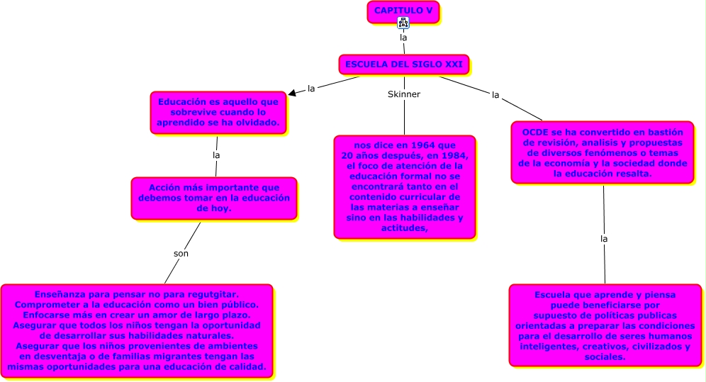 Este Cmap, tiene información relacionada con: CAPITULO V, OCDE se ha convertido en bastión de revisión, analisis y propuestas de diversos fenómenos o temas de la economía y la sociedad donde la educación resalta. la Escuela que aprende y piensa puede beneficiarse por supuesto de políticas publicas orientadas a preparar las condiciones para el desarrollo de seres humanos inteligentes, creativos, civilizados y sociales., ESCUELA DEL SIGLO XXI Skinner nos dice en 1964 que 20 años después, en 1984, el foco de atención de la educación formal no se encontrará tanto en el contenido curricular de las materias a enseñar sino en las habilidades y actitudes,, Acción más importante que debemos tomar en la educación de hoy. son Enseñanza para pensar no para regutgitar. Comprometer a la educación como un bien público. Enfocarse más en crear un amor de largo plazo. Asegurar que todos los niños tengan la oportunidad de desarrollar sus habilidades naturales. Asegurar que los niños provenientes de ambientes en desventaja o de familias migrantes tengan las mismas oportunidades para una educación de calidad., CAPITULO V la ESCUELA DEL SIGLO XXI, ESCUELA DEL SIGLO XXI la Educación es aquello que sobrevive cuando lo aprendido se ha olvidado., Educación es aquello que sobrevive cuando lo aprendido se ha olvidado. la Acción más importante que debemos tomar en la educación de hoy., ESCUELA DEL SIGLO XXI la OCDE se ha convertido en bastión de revisión, analisis y propuestas de diversos fenómenos o temas de la economía y la sociedad donde la educación resalta.