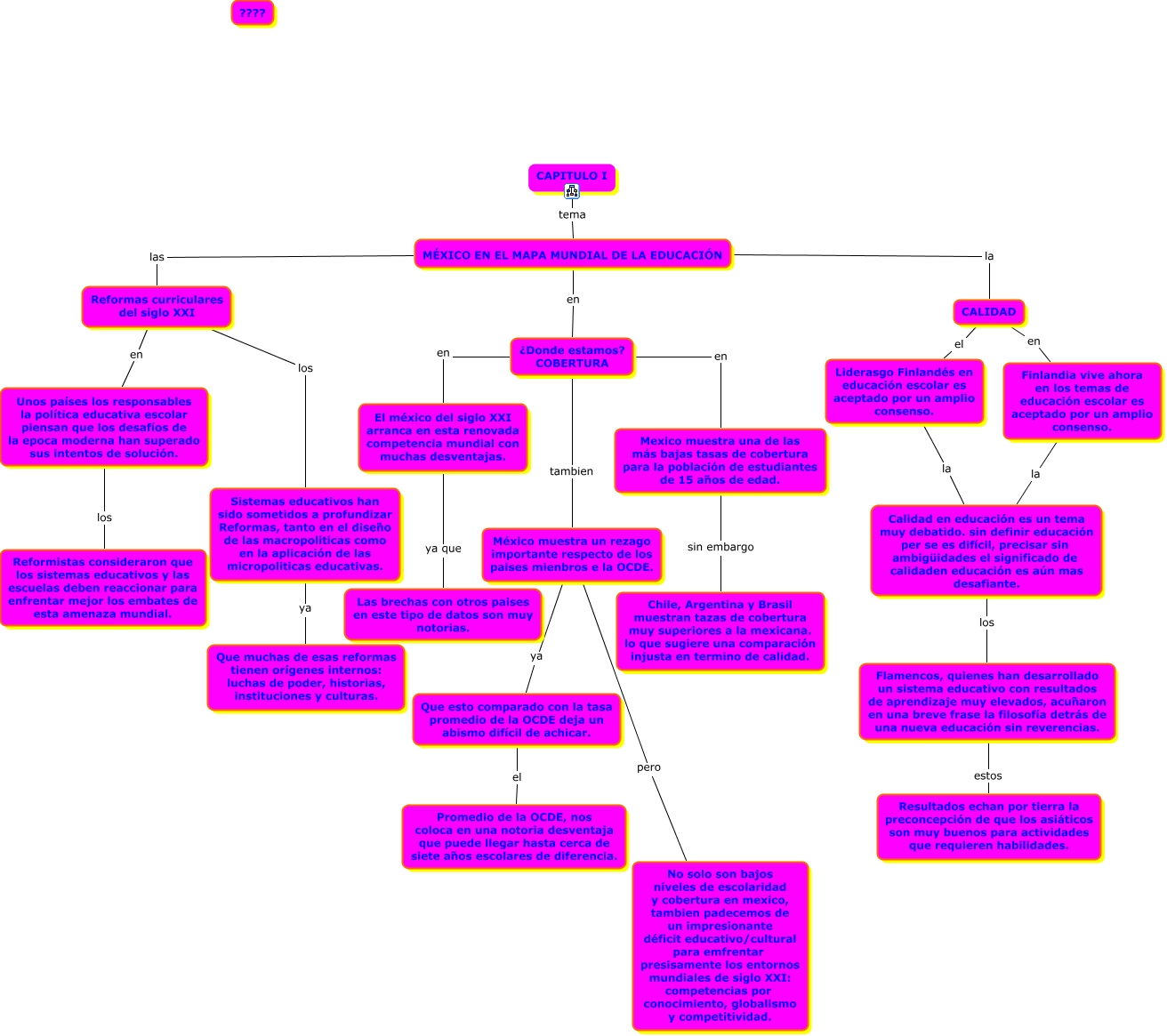 Este Cmap, tiene información relacionada con: CAPITULO I, Reformas curriculares del siglo XXI los Sistemas educativos han sido sometidos a profundizar Reformas, tanto en el diseño de las macropoliticas como en la aplicación de las micropoliticas educativas., México muestra un rezago importante respecto de los paises mienbros e la OCDE. pero No solo son bajos niveles de escolaridad y cobertura en mexico, tambien padecemos de un impresionante déficit educativo/cultural para emfrentar presisamente los entornos mundiales de siglo XXI: competencias por conocimiento, globalismo y competitividad., MÉXICO EN EL MAPA MUNDIAL DE LA EDUCACIÓN la CALIDAD, ¿Donde estamos? COBERTURA tambien México muestra un rezago importante respecto de los paises mienbros e la OCDE., CALIDAD en Finlandia vive ahora en los temas de educación escolar es aceptado por un amplio consenso., Mexico muestra una de las más bajas tasas de cobertura para la población de estudiantes de 15 años de edad. sin embargo Chile, Argentina y Brasil muestran tazas de cobertura muy superiores a la mexicana. lo que sugiere una comparación injusta en termino de calidad., Reformas curriculares del siglo XXI en Unos países los responsables la política educativa escolar piensan que los desafíos de la epoca moderna han superado sus intentos de solución., ¿Donde estamos? COBERTURA en Mexico muestra una de las más bajas tasas de cobertura para la población de estudiantes de 15 años de edad., MÉXICO EN EL MAPA MUNDIAL DE LA EDUCACIÓN en ¿Donde estamos? COBERTURA, El méxico del siglo XXI arranca en esta renovada competencia mundial con muchas desventajas. ya que Las brechas con otros paises en este tipo de datos son muy notorias., Unos países los responsables la política educativa escolar piensan que los desafíos de la epoca moderna han superado sus intentos de solución. los Reformistas consideraron que los sistemas educativos y las escuelas deben reaccionar para enfrentar mejor los embates de esta amenaza mundial., Finlandia vive ahora en los temas de educación escolar es aceptado por un amplio consenso. la Calidad en educación es un tema muy debatido. sin definir educación per se es difícil, precisar sin ambigüidades el significado de calidaden educación es aún mas desafiante., MÉXICO EN EL MAPA MUNDIAL DE LA EDUCACIÓN las Reformas curriculares del siglo XXI, Flamencos, quienes han desarrollado un sistema educativo con resultados de aprendizaje muy elevados, acuñaron en una breve frase la filosofía detrás de una nueva educación sin reverencias. estos Resultados echan por tierra la preconcepción de que los asiáticos son muy buenos para actividades que requieren habilidades., ¿Donde estamos? COBERTURA en El méxico del siglo XXI arranca en esta renovada competencia mundial con muchas desventajas., CALIDAD el Liderasgo Finlandés en educación escolar es aceptado por un amplio consenso., México muestra un rezago importante respecto de los paises mienbros e la OCDE. ya Que esto comparado con la tasa promedio de la OCDE deja un abismo difícil de achicar., CAPITULO I tema MÉXICO EN EL MAPA MUNDIAL DE LA EDUCACIÓN, Liderasgo Finlandés en educación escolar es aceptado por un amplio consenso. la Calidad en educación es un tema muy debatido. sin definir educación per se es difícil, precisar sin ambigüidades el significado de calidaden educación es aún mas desafiante., Calidad en educación es un tema muy debatido. sin definir educación per se es difícil, precisar sin ambigüidades el significado de calidaden educación es aún mas desafiante. los Flamencos, quienes han desarrollado un sistema educativo con resultados de aprendizaje muy elevados, acuñaron en una breve frase la filosofía detrás de una nueva educación sin reverencias.