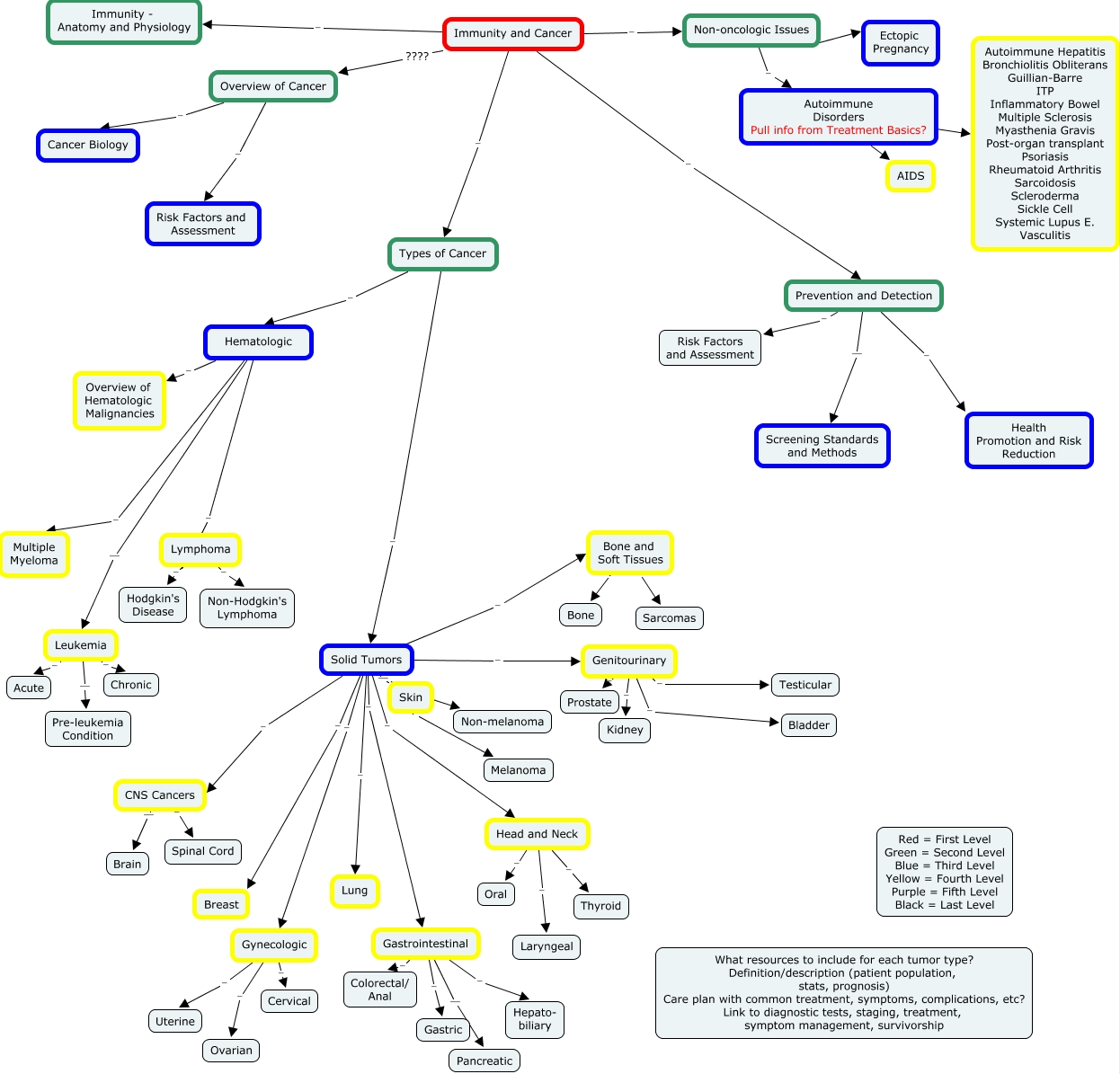 This Concept Map, created with IHMC CmapTools, has information related to: Cancer and immunity, Immunity and Cancer - Immunity - Anatomy and Physiology, Bone and Soft Tissues - Bone, Head and Neck - Oral, Head and Neck - Thyroid, Solid Tumors - Lung, Non-oncologic Issues - Autoimmune Disorders Pull info from Treatment Basics?, Hematologic -- Leukemia, Solid Tumors - Gastrointestinal, Solid Tumors - Bone and Soft Tissues, Genitourinary - Testicular, Skin - Melanoma, Genitourinary - Bladder, Hematologic - Multiple Myeloma, Skin - Non-melanoma, Gynecologic - Uterine, Gastrointestinal - Colorectal/ Anal, Types of Cancer - Solid Tumors, Autoimmune Disorders Pull info from Treatment Basics? ???? AIDS, Prevention and Detection - Health Promotion and Risk Reduction, Immunity and Cancer ???? Overview of Cancer