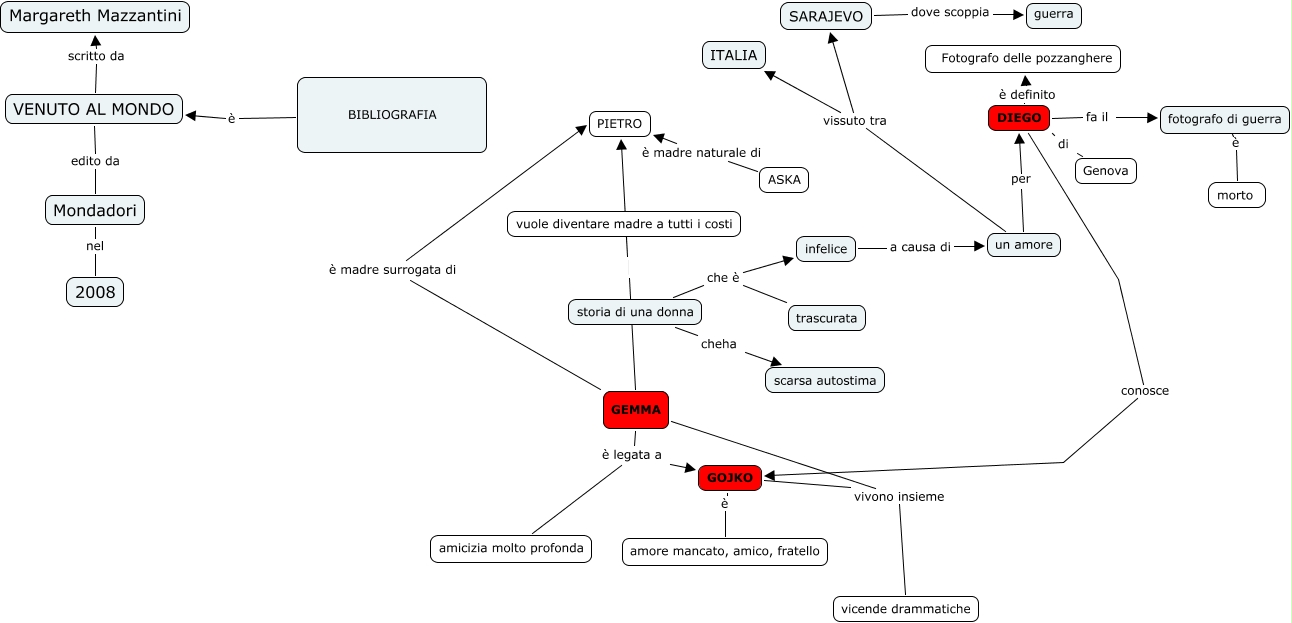 Questa Cmap, creata con IHMC CmapTools, contiene informazioni relative a: VENUTO AL MONDO, GEMMA PIETRO, storia di una donna che è infelice, DIEGO è definito Fotografo delle pozzanghere, un amore vissuto tra ITALIA, VENUTO AL MONDO edito da Mondadori, BIBLIOGRAFIA è VENUTO AL MONDO, GOJKO vivono insieme vicende drammatiche, morto è fotografo di guerra, Genova di DIEGO, GOJKO è amore mancato, amico, fratello, GEMMA è legata a amicizia molto profonda, GEMMA vivono insieme vicende drammatiche, GEMMA è legata a GOJKO, DIEGO fa il fotografo di guerra, infelice a causa di un amore, Mondadori nel 2008, VENUTO AL MONDO scritto da Margareth Mazzantini, un amore per DIEGO, storia di una donna che è trascurata, DIEGO conosce GOJKO